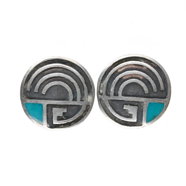 c1950 Lambert Homer Sr. Zuni Blue Gem Turquoise flush inlay sterling silver screw back earrings. Great earrings with no issues, tested and guaranteed solid sterling silver, any marks detected, weight, and measurements will be shown in the pictures. Circa second quarter of the 20th century to mid 20th century, large and unique with high grade turquoise.  Unmarked, attributed. Homer, Lambert Sr. Biography (1917-1972)Widely recognized as a fine lapidarist, Lambert Homer collaborated with other artists who worked with trader C. G. Wallace. He is perhaps best known for pieces featuring intricate mosaic inlay on spiny oyster shell that closely resemble shell inlay work found at prehistoric Southwestern sites. After removing the spines from these distinctively coral-colored shells, Homer inlaid them with white shell, turquoise and jet, creating vibrant geometric patterns. Some of his most spectacular pieces are belts with conchas of inlaid spiny oyster shell. Homer also made inlaid Knife Wings and Rainbow Gods, and he is credited with the first use of the Gan dancer as a jewelry design motif.