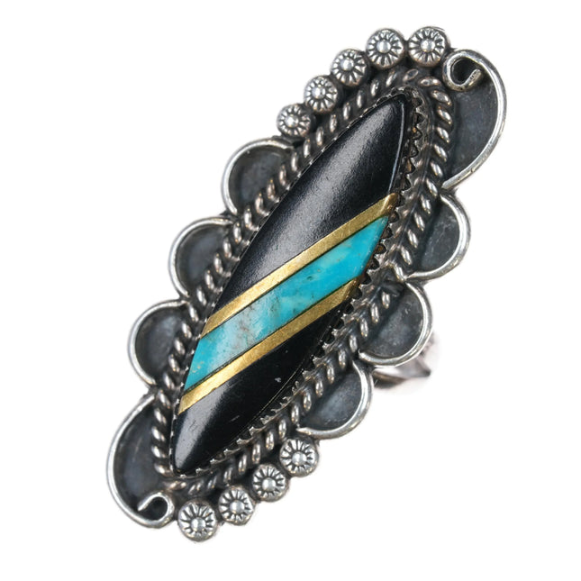 sz4.5 Vintage Zuni Sterling, turquoise, and shell channel inlay ring
