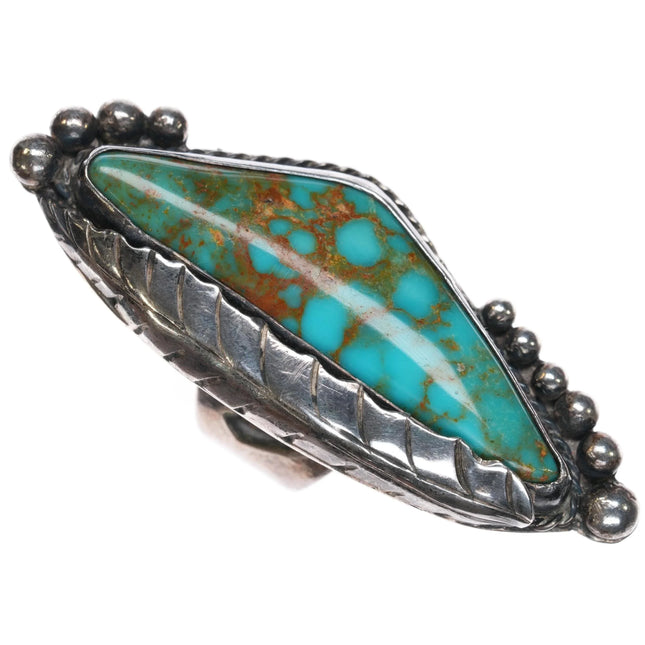 sz4.5 Vintage Navajo silver and turquoise ring. No identifying marks 1.25" long face, 9.3 grams. All precious metals are tested and guaranteed,