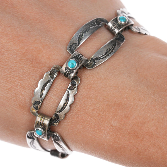 7" Heavy/wide Vintage Navajo sterling silver turquoise cluster link bracelet