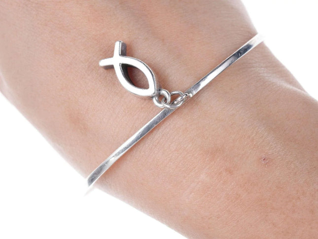 Ruhestand James Avery Sterling Ithaca Fish Armreif, passt bequem an ein Handgelenk mit einem Umfang von bis zu 8" und ist ohne Probleme sauber. Auf dem Armband und dem Fisch markiert.