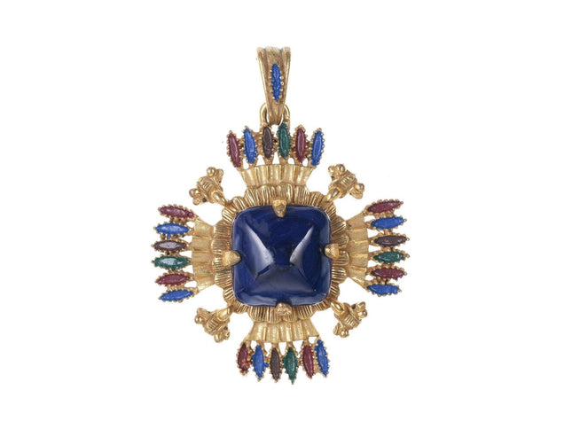 Große Castlecliff Larry Vrba Blau-Rot-Emaille-Anhänger im Maya-Stil aus den 1970er Jahren. 3" hoch mit Bügel x 2,25" breit ohne Probleme. Tolles Stück Vintage-Modeschmuck.