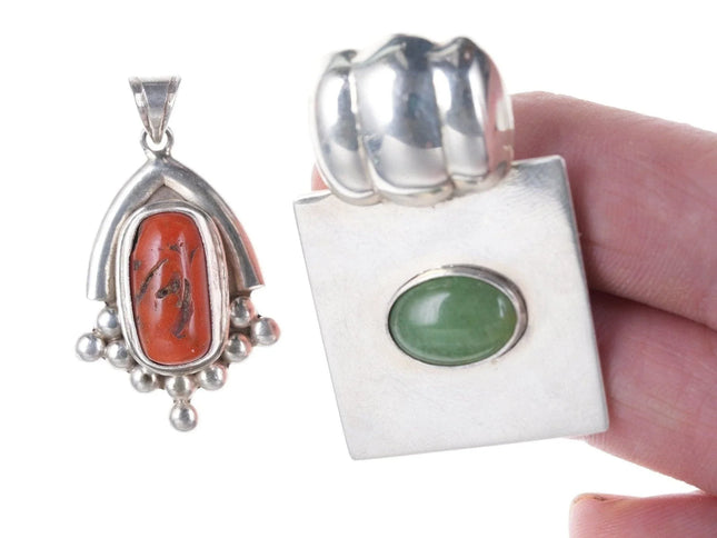 2 Anhänger aus Sterlingsilber im südwestlichen Stil. Eine Koralle, eine scheint aus Jade zu sein, ungetestet. Beide Sterling. Größte 1,25" x 1 7/8" 25,1 Gramm insgesamt. Alle Edelmetalle werden geprüft und garantiert. Jeder als Silber oder Sterling bezeichnete Schmuck der amerikanischen Ureinwohner besteht garantiert zu mindestens 90 % (Münz-)Silber und möglicherweise zu einem höheren Gehalt. Alles, was markiert ist, ist garantiert das, was markiert ist. Die meisten Armbänder werden an einem 6-Zoll-Handgelenk (nicht behaart) fotografiert, Ringe, wenn möglich, an einem Finger der entsprechenden Größe. Bei Armbändern wird der Innenumfang angezeigt, wenn das Maß nicht in der Beschreibung angegeben ist wo das Metall auf die Zahl auf dem Maßband trifft.