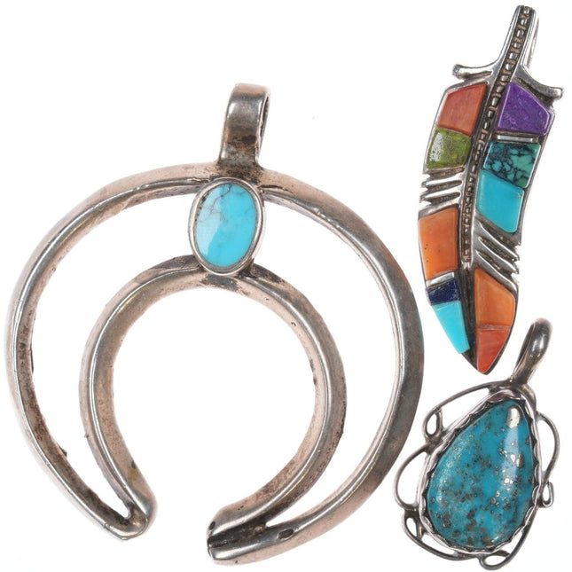 3 Hogans Vintage Native American sterling and turquoise cluster pendant. Weight and measurements in pics. All precious metals are tested and guaranteed,