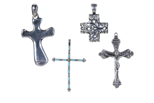 4 Vintage-Kreuzanhänger aus Sterlingsilber aus verschiedenen Regionen und Epochen. Höchste 1,5" kein Schaden