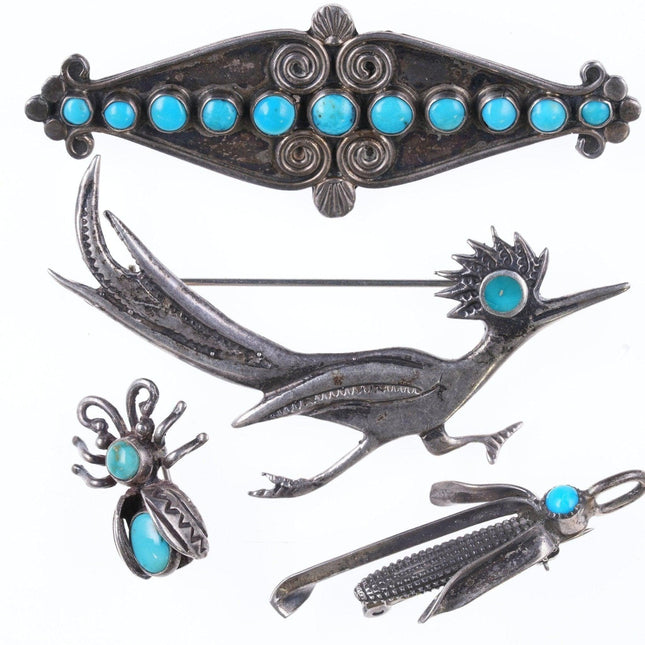4 Vintage Native American Sterling und Türkis Pins/Anhänger. Schöne ältere Anstecknadeln von höherer Qualität, der Mais dient auch als Anhänger. Roadrunner 2 3/8" breit x 1,5" hoch für den Maßstab. Alles aus Sterlingsilber und natürlichem Türkis, alles ohne Markierung. Insgesamt 21,7 Gramm.Alle Edelmetalle werden getestet und garantiert. Jeder als Silber oder Sterling bezeichnete Schmuck der amerikanischen Ureinwohner besteht garantiert zu mindestens 90 % (Münz-)Silber und möglicherweise zu einem höheren Gehalt. Bei allem, was markiert ist, handelt es sich garantiert um das, was markiert ist. Die meisten Armbänder werden an einem 6-Zoll-Handgelenk (nicht behaart) fotografiert, Ringe, wenn möglich, an einem Finger der entsprechenden Größe. Bei Armbändern wird der Innenumfang angezeigt, wenn das Maß nicht in der Beschreibung angegeben ist wo das Metall auf die Zahl auf dem Stoffmaßband trifft.