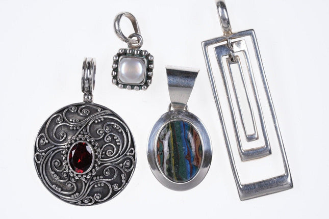 4 Vintage-Anhänger aus Sterlingsilber im Südwesten. Verkaufe die 4 Anhänger mit verschiedenen Steinen, wahrscheinlich von amerikanischen Ureinwohnern hergestellt. Der linke Anhänger ist 2 1/16 Zoll hoch mit Öse. 17,3 Gramm Gesamtgewicht.