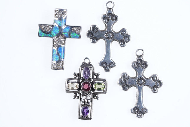 4 Vintage-Kreuzanhänger aus Sterlingsilber aus verschiedenen Regionen und Epochen. Höchste 2,75 Zoll, kein Schaden