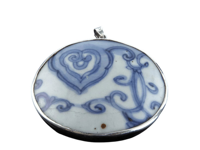 Antiker chinesischer Porzellanscherben-Anhänger in Sterling-Fassung. 2 3/8" breit x 2 1/8" hoch. 16,7 Gramm. Abgebildete Scherbe aus dem 19. Jahrhundert oder früher, später montiert in Sterling-Fassung.