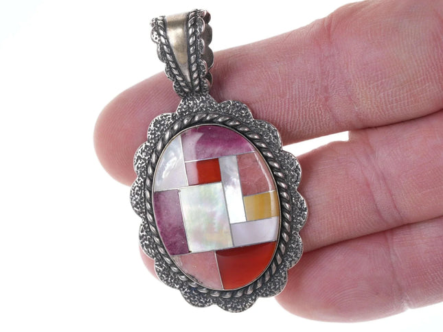 Alvin and Lula Begay Navajo silver, turquoise, and coral pendant<br><br>In 1956, Alvin and Lula Begay were both born into artistic families in Winslow, Arizona. They have worked as a silversmithing team since 1991, each serving their own role; Alvin works on the overall composition and construction of the piece, while Lula works on the setting/cutting of the stones as well as the polishing and final touches.<br><br>The dynamic pair is known to not use any pre-made findings, everything outside of earring posts are handcrafted. Alvin is especially known for using his techniques of double and triple overlay, reversible necklaces, shadowboxes, and engraving--often all on the same piece!<br><br>While still very adept in the art of jewelry-making, Alvin’s first love is bareback riding in rodeos. He grew up in a traditional Navajo life style on the reservation and is a natural athlete and cowboy. He has competed for 10 years, winning championships in 1987 and 1989. Although Alvin is a very humble and unassuming individual, he is one on AIRCA’s top award winners. Awards in jewelry-making are also no stranger to Alvin; among several awards, he has won first with a necklace in a competition in Dallas, Texas.<br><br> Marked or unmarked as shown in pics, weight and other measurements in pics. Sorry but my jewelry is stored in a secure location and cannot be accessed for more pictures,<br>videos, or measurements until sold. If you look at pictures/description your<br>question should be answered. Thank you so much for your time and consideration!<br><br>All precious metals are tested and guaranteed. A Native American jewelry piece referred to as "silver" or "ingot" is guaranteed to be at least 90% silver. Bracelets are photographed on a 6" women's wrist.