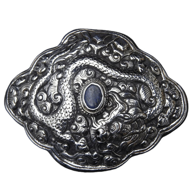 Antike chinesische Drachengürtelschnalle aus der Qing-Dynastie aus Silber, die später in eine Brosche umgewandelt wurde. Sie können die drei Reparaturstellen auf der Rückseite sehen, an denen die Schnalle entfernt wurde, um sie später wahrscheinlich Mitte des 20. Jahrhunderts in eine Brosche umzuwandeln. Schönes großes Qualitätsstück 3,25" x 2,5"