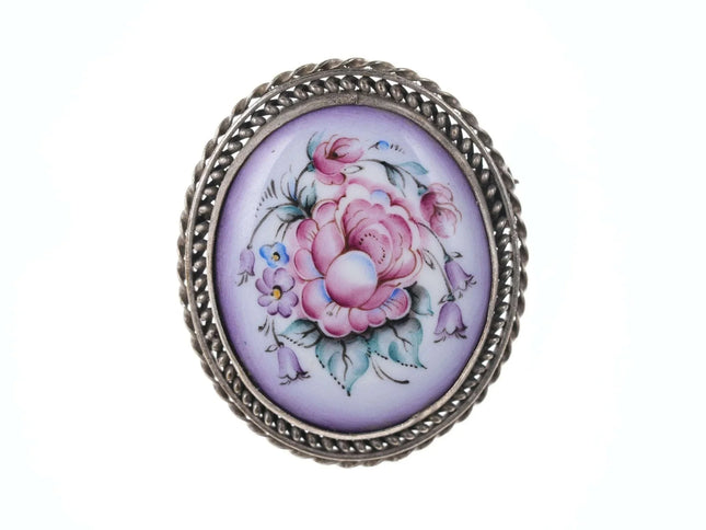Vintage handbemalte Emaille Brosche. Wunderschöne handbemalte Brosche auf Kupferemail in silbernem Rahmen (unbekannter Inhalt). Der Stift auf der Rückseite ist aus Stahl. 1 5/8" hoch x 1 3/8" breit.