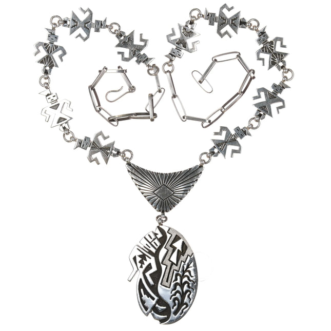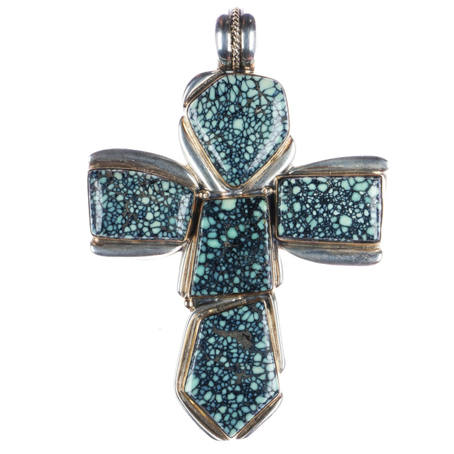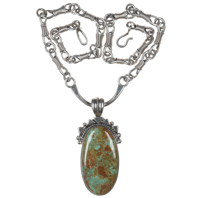 Richard Tsosie Navajo high grade spiderweb turquoise sterling silver pendant. Circa last quarter of the 20th century, tested and guaranteed solid sterling silver. No apparent issues. 18" long. Very high grade natural American turquoise likely from a Nevada mine. #8, Lone Mountain, Indian Mountain, one of those. Richard Tsosie jewelry is featured in books, magazines and museums; including the permanent collections of The Museum of Man in San Diego, The Smithsonian, The Heard Museum, and The Museum of Northern Arizona. Richard Tsosie and his brother Boyd came to public attention when they were featured in the August 1979 Jewelry Collectors Issue of Arizona Highways Magazine. Richard is a Navajo jeweler and sculptor from Flagstaff, AZ and the Wide Ruins area of the Navajo Nation. He is currently living in Scottsdale, AZ. His work has been featured in American Indian Art Magazine, Arizona Highways Magazine, the video “Beyond Tradition: Contemporary Indian Art and Its Evolution”, as well as several books including, Southwestern Indian Jewelry by Dexter Cirillo and Enduring Traditions, Art of the Navajo by Jerry Jacka. Richard’s work has been exhibited in galleries and museums from New York to California. He explains that his designs represent the beauty of life. The arrows are things that come natural like the lightening in the sky. There are ups and downs in life as there are in his designs, and that is what makes you strong.