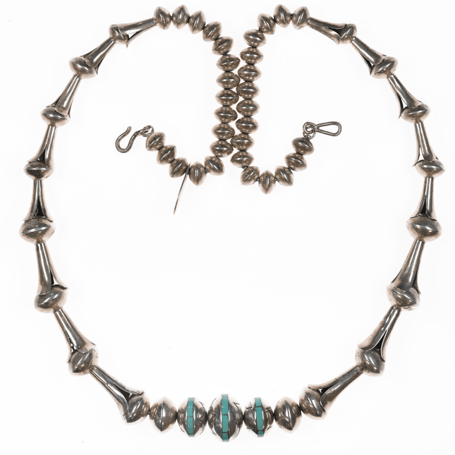 23.5" Leo Yazzie Handmade beads Navajo pearl Necklace vintage sterling silver. Solid sterling silver tested and guaranteed with weight and measurements in the pictures. Circa last quarter of the 20th century. No issues, 23.5" long necklace. Handmade beads, Signed LY on tab by clasp. high quality necklace.