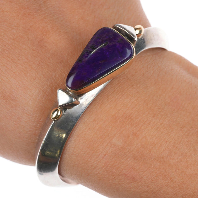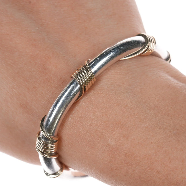 7.5" Heavy Bruce Morgan Navajo 14k gold/sterling silver cuff bracelet. Tested and guaranteed solid sterling silver with weight and measurements in pictures. Circa last quarter of the 20th century with age appropriate wear.. 7.5" Bracelets are shown in the photos with a tape measure inside the bracelet, other photos will typically show the gap size. The size at the beginning of the title includes the gap. Very high quality, unknown/unresearched artist due to time limitations.
