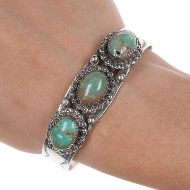 6.1" Esther Wood Navajo sterling silver high grade turquoiise cuff bracelet. Tested and guaranteed solid sterling silver with weight and measurements in pictures. Circa fourth quarter of the 20th century with age appropriate wear.. Bracelets are shown in the photos with a tape measure inside the bracelet, other photos will typically show the gap size. The size at the beginning of the title includes the gap. Esther Wood is a celebrated Navajo (Diné) silversmith and jeweler known for her exceptional craftsmanship and detailed work with sterling silver, turquoise, and other stones. Her pieces are sought after by collectors and have been featured in major art collections, including the Smithsonian American Art Museum