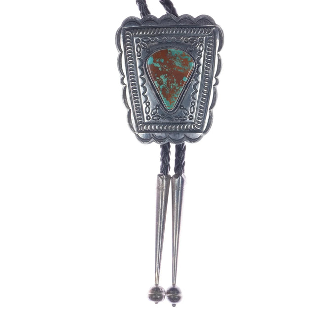 c1950‘s Roy Vandever Navajo sterling silver, turquoise, coral bolo tie Tested and guaranteed solid sterling silver slide and tips. Weight and measurements in pictures. Great bolo, 39" long with no issues. Tray is tared out, so weight shown is just the bolo of course. Roy Vandever, Diné, Navajo Nation, active ca 1950s-2009: silver stampwork, shadowbox, chip inlay jewelry. Roy Vandever was the son of Walter Vandever and Emma Vandever; uncle of Esther Vandever Wood; husband of Donna Vandever; father of Cassandra Xalladitto, Cindy Howe, Verna Kee, Sheila Vandever, Sherwood Vandever, and Jerome Vandever.