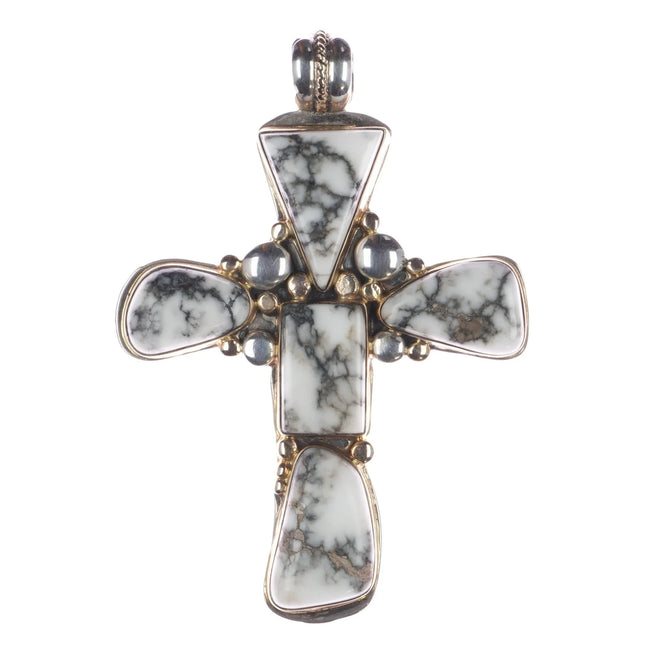 Jim Harrison Navajo 14k gold Tufa Cast coral/turquoise/sugilite inlay reversible pendant. Tested and guaranteed solid 14k gold with weight and measurements in pictures. All stones, secure and intact with no apparent issues. Signed by Harrison Jim with an additional hallmark. I believe the Tufa casting was done by H Jim and possibly the inlay work done by another extremely skilled artist that I didn‘t attempt to identify. Harrison Jim is Navajo and a member of the Red House Clan. Born and raised in Gallup, New Mexico. Growing up, he was exposed to the traditional arts through his aunt and grandmother who often wore beautiful pieces and would also weave rugs at home. This early exposure sparked a strong interest in the arts for him. Harrison honed his skills by apprenticing under renowned jewelers such as John Hall, Tommy Jackson, and McKee Platero. These mentors not only taught him the technical aspects of jewelry making, but also instilled in him a deep respect for the traditional Navajo methods and materials. Harrison also pursued formal training through various workshops and classes to further refine his craft. Harrison has developed a unique style that sets his work apart from others in the industry. He blends traditional Navajo techniques with contemporary designs, resulting in pieces that are both modern and rooted in tradition. His attention to detail and use of high quality materials have earned him a loyal following among collectors and admirers alike. His designs are reflective of bright stars in the New Mexico nights and his geometric forms, of the landscape. With his sleek and contemporary shapes and designs, he manages to balance the flavor of tradition along with his stylized approach to Indian imagery. The colorful and innovative inlays in his jewelry are inspired by the natural gifts that Mother Earth and Father Sky provide to each and every one of us.