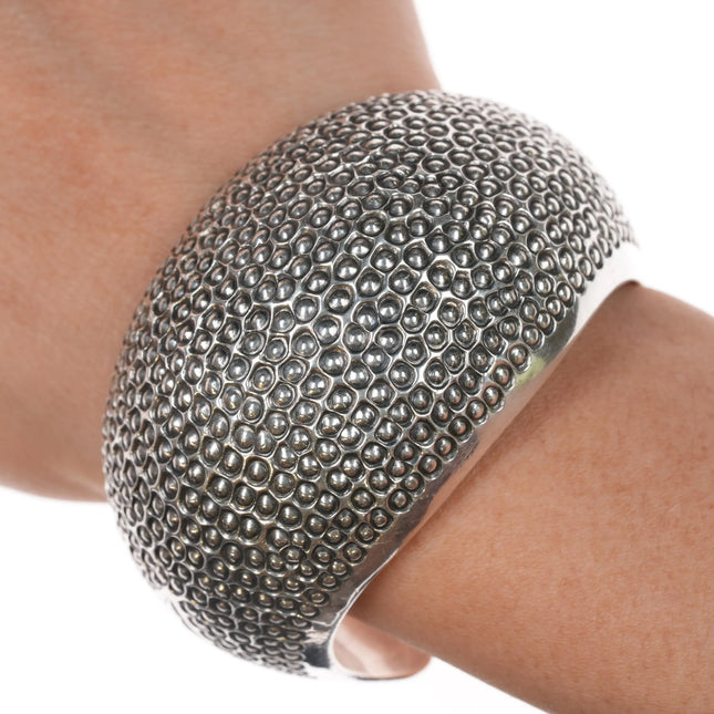 6.75" Herman Vandever Navajo sterling silver wide band stamped cuff bracelet. Tested and guaranteed solid sterling silver with weight and measurements in pictures. No damage or significant wear, circa last quarter of the 20th century.
