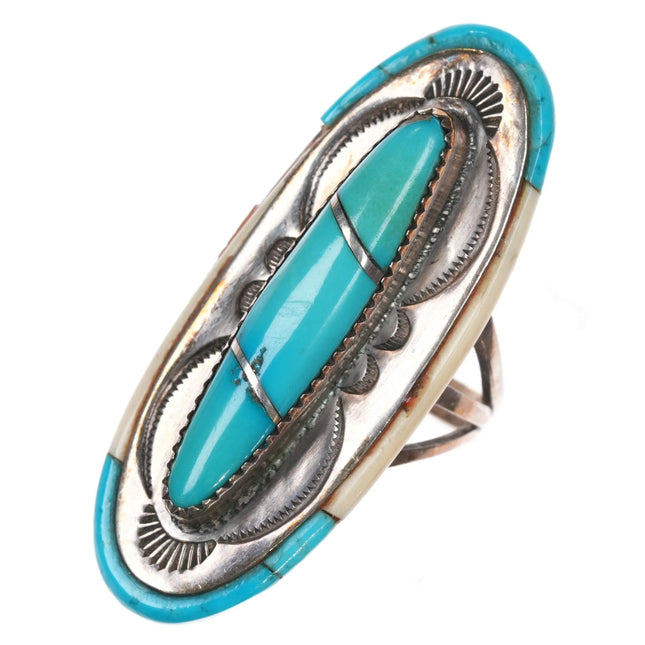 sz4 Tommy Singer Navajo sterling silver peyote bird chip inlay turquoise ring. Nice ring from the third quarter of the 20th century. Some expected age appropriate wear, weight and measurements in pictures, tested and guaranteed solid sterling silver. Any marks present will be shown in the pictures, if there are no marks shown in the pictures or it isn‘t attributed to a specific maker then please assume it is unmarked which is very common with older Native American silver jewelry.