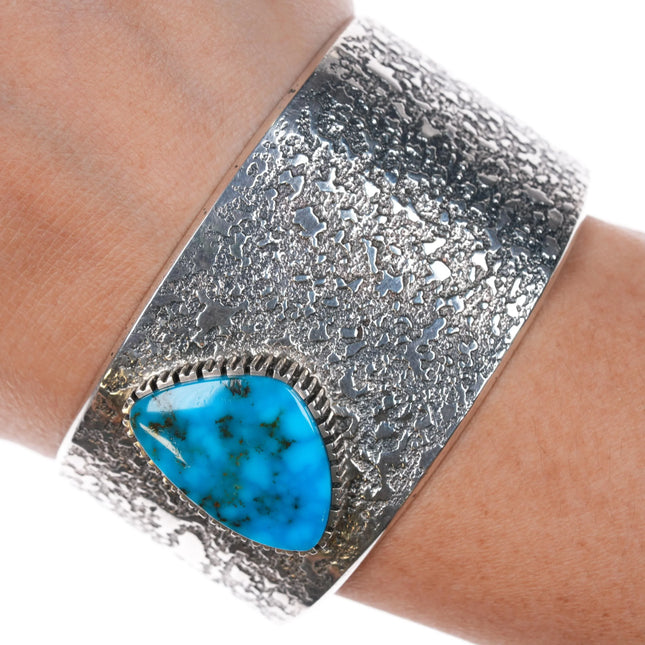 6.5" Kirk Smith Navajo sterling silver hi-grade Royston Turquoise cuff bracelet. Tested and guaranteed solid sterling silver with weight and measurements in pictures. Good condition, circa last quarter of the 20th century. Stone secure, with no damage. Kirk Smith ( 1957-2012 ) was a Native American of the Dine tribe. His clan name is Kiyaa Alani Shush Dine (Towering House Bear People Clan). In the 1960s, at age seven, he helped his grandfather John Smith work with primitive tools on silver at his bench in his small work shop. From 1969 to 1972, he started to learn sand casting from his family. By 1980 he was able to earn his living full time from silver smithing. During this time he was mentored by famed silver smith and brother in law, Harry Morgan. Kirk specialized in traditional Navajo jewelry set with high grade stones. His work was always top quality and was one of the best Navajo silversmiths around. He had been making quality handmade silver and stone jewelry for decades. “My sister was married to Harry Morgan and he really taught me how to design a piece. Before I never really paid much attention to the style. That changed because of Harry. He also had a big name and was well known. I wanted to be one of those people. My grandfather told me When you leave something here, your name will always be here. Kirk passed away tragically on September 17, 2012 in Albuquerque, NM. Kirk was killed by a drunk driver in an unfortunate tragedy on September 17, 2012. He was only 55 years old and in his prime, both as a jeweler and as an individual. He will be deeply missed by family, friends and Native American Indian jewelry collectors and traders everywhere. Andy Cadman grew up in Gallup, New Mexico and attended Tohatchee High School. He currently has three children and enjoys being a full-time jeweler. Aside from his work, Andy has a passion for travel and golf.