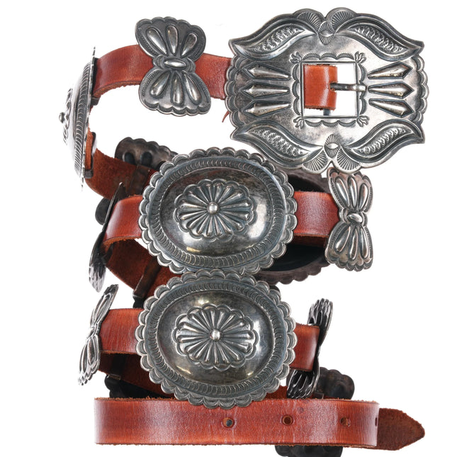 35" Albert Platero Navajo sterling silver hand stamped vintage concho belt. Fits up to a 35" waist with existing holes, but can be hooked shorter or a few holes could be added later. Tape measure shown in pics.. Weight and measurements in pictures. No damage or issues, tested and guaranteed solid sterling silver. 1 buckle and 10 conchos, circa last quarter of the 20th century. Navajo silversmith Albert Platero was born on the Navajo reservation in To‘hajiilee, New Mexico, thirty miles west Of Albuquerque, New Mexico. He has been creating outstanding classic silver work since the rise of its popularity in the 1970‘s. "Platero" means "silversmith" in Spanish, so it perhaps makes sense that the Platero family has so many talented silver smiths in it. Albert is the uncle of Vincent Platero, another outstanding silversmith.