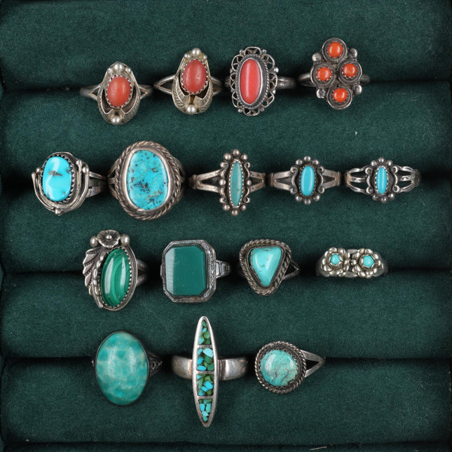 Sz4.5-10 vintage Collection sterling silver Turquoise Navajo, Zuni rings coral. Selling the 16 rings shown with weight and measurements in pictures. All are tested and guaranteed Solid sterling silver. Various makers, ages, and stones. All solid sterling silver, tested, some marked. These will be packed immediately after listing and won‘t be available to answer questions on specific rings. I‘m going to try offering some of these as lots due to time limitations, so selling partial lots or answering a bunch of questions will defeat the purpose.