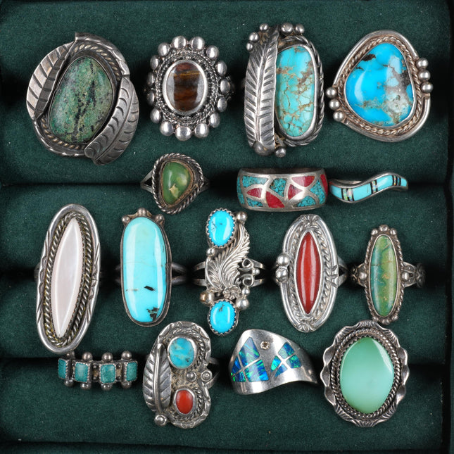sz5-11 Navajo/Zuni/Southwestern sterling silver turquoise/shell/coral rings lot. Tested and guaranteed solid sterling silver. Selling the 18 rings shown with weight and measurements in pictures, shown on sizers. Age appropriate wear. Some marked, some not marked. I am making lots of these lots with my wife photographing and me listing. We are listing in lots due to time limitations, so we are not heavily scrutinizing each ring. Most are going to be Native American made, but there will likely be some southwestern style rings mixed in each lot. My wife who is making the lots doesn‘t know the difference as she‘s Vietnamese. Please look at the pictures and make up your own mind for condition, etc. There may be dents, cracked stones, etc. I tried to weed out any junk before I gave them to her, but we are in a hurry. Time is the number one consideration when making these lots so there will be some surprises, hopefully more good than bad :)