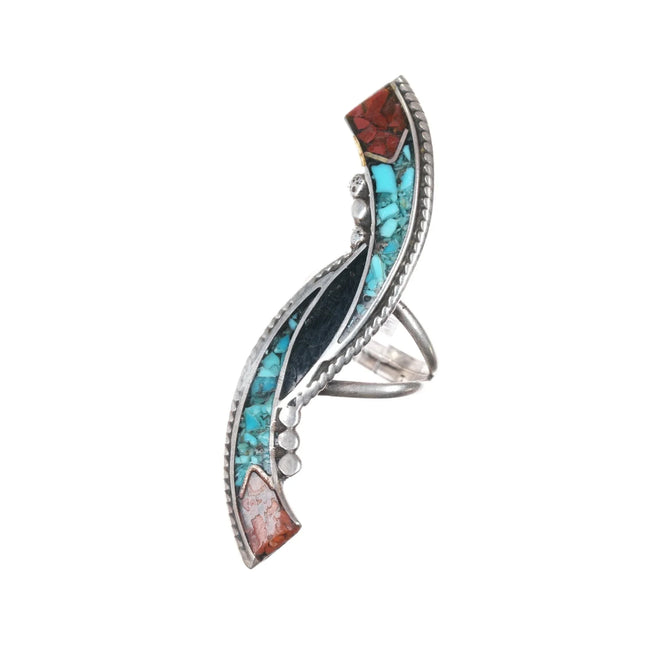 sz4 Large 1970‘s Navajo chip inlay sterling ring. 1970‘s, unmarked with no issues, solid sterling. Weight and measurements in pics. Most rings are shown on a a ring sizer in the pictures and the size is typically given at the beginning of the title and description. Women's Size 4 Ring.