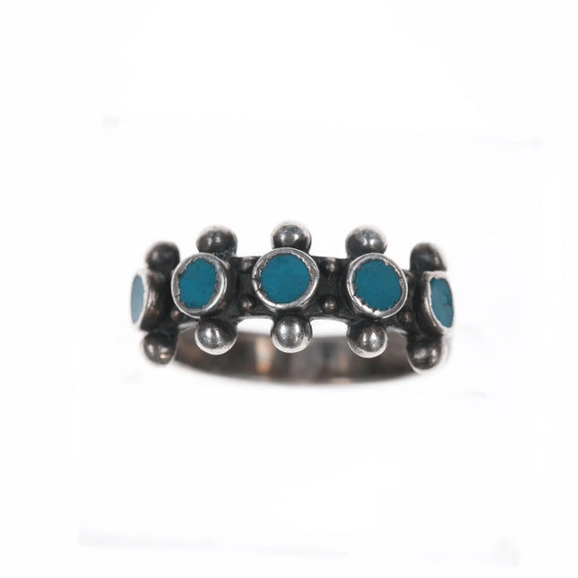 sz4.75 30's-40's Bell Trading Post Silver and turquoise row ringAll precious metals are tested and guaranteed, any Native American jewelry<br>referred to as Silver or Sterling is guaranteed to be a minimum of 90% (coin) silver and possibly higher content. Anything marked is guaranteed to be what it's marked, most bracelets are photographed on a 6" wrist (non hairy), rings<br>photographed on the appropriate sized finger when possible. With bracelets if<br>the measurement is not given in the description then inside circumference is<br>shown where the metal meets the number on the the cloth tape measure. Most rings are shown on a a ring sizer in the pictures and the size is typically given at the beginning of the title and description. Women's Size 4 Ring.