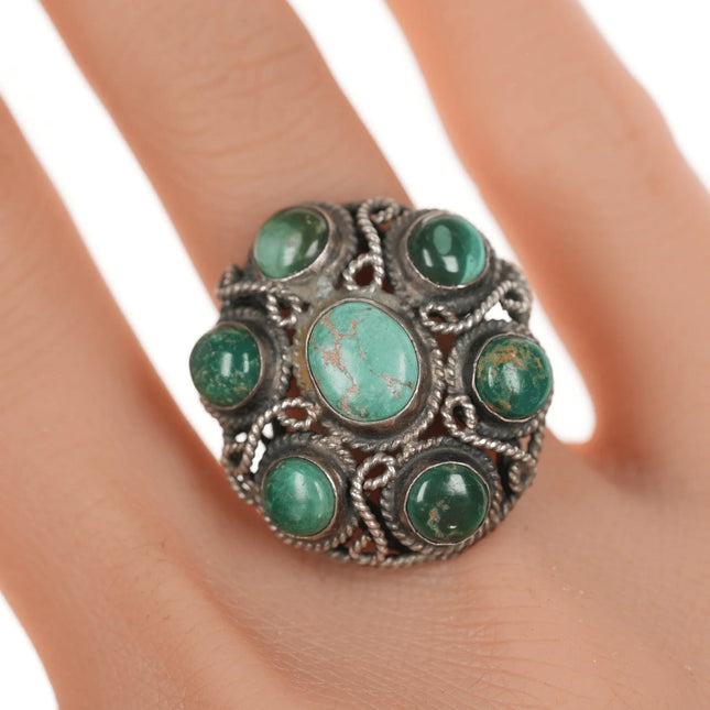 sz4.5 Vintage silver turquoise cluster ring, unsure of Origon, circa mid 20th century.<br><br>Marked or unmarked as shown in pics, weight and other measurements in pics. Sorry but my jewelry is stored in a secure location and cannot be accessed for more pictures,<br>videos, or measurements until sold. If you look at pictures/description your<br>question should be answered. Thank you so much for your time and consideration!<br><br>All precious metals are tested and guaranteed. A Native American jewelry piece referred to as "silver" or "ingot" is guaranteed to be at least 90% silver. Bracelets are photographed on a 6" women's wrist. Most rings are shown on a a ring sizer in the pictures and the size is typically given at the beginning of the title and description. Women's Size 4 Ring.