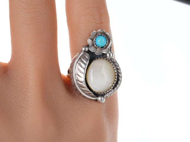 sz4 Vintage Native American silver and turquoise ring with leaf accents<br><br> Marked or unmarked as shown in pics, weight and other measurements in pics. Sorry but my jewelry is stored in a secure location and cannot be accessed for more pictures,<br>videos, or measurements until sold. If you look at pictures/description your<br>question should be answered. Thank you so much for your time and consideration!<br><br>All precious metals are tested and guaranteed. A Native American jewelry piece referred to as "silver" or "ingot" is guaranteed to be at least 90% silver. Bracelets are photographed on a 6" women's wrist. Most rings are shown on a a ring sizer in the pictures and the size is typically given at the beginning of the title and description. Women's Size 4 Ring.