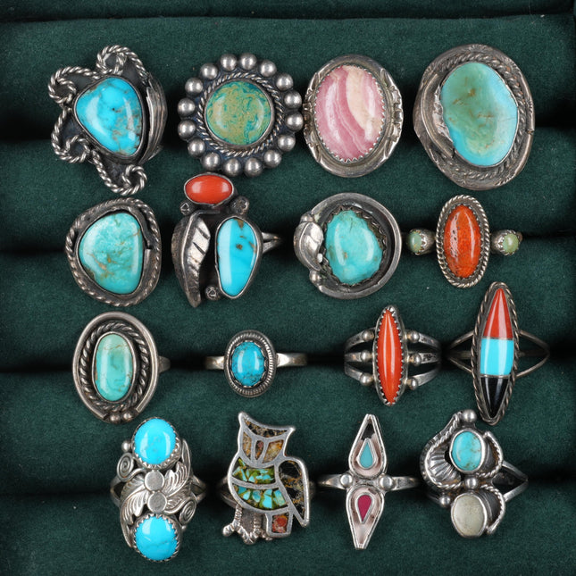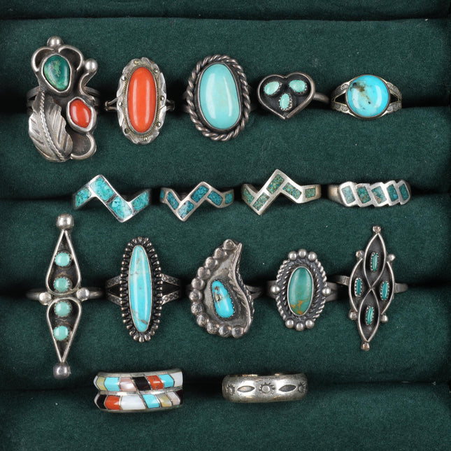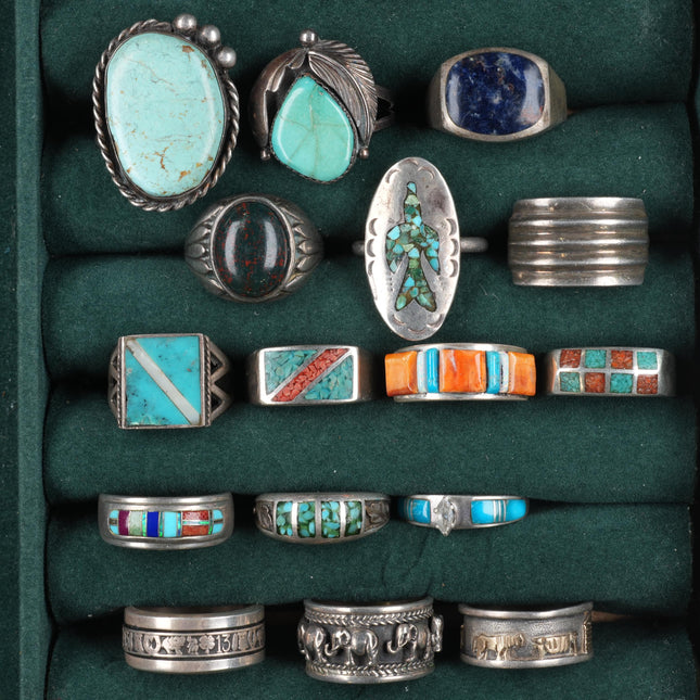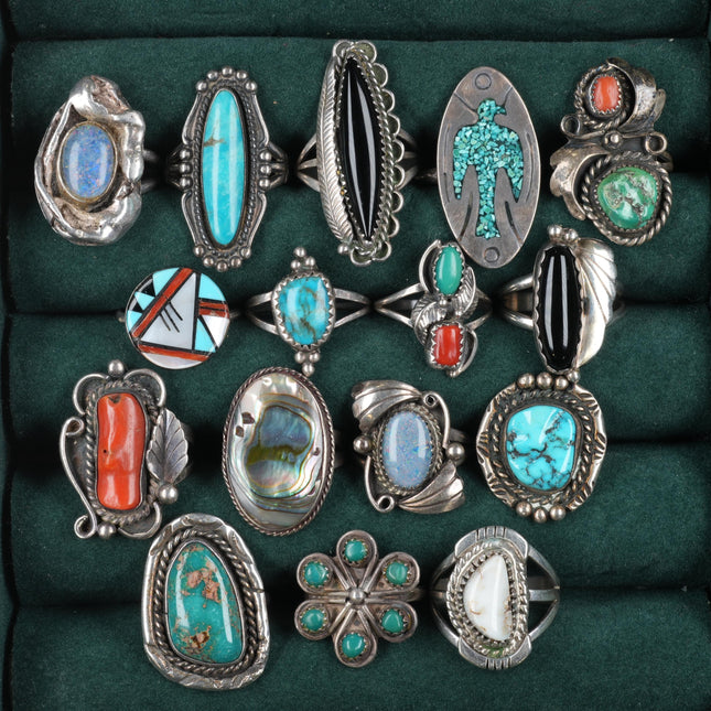 sz4.5-10 vintage Navajo/Zuni/southwest style sterling silver turquoise rings lot. Nice ring lot from the last half of the 20th century. Some expected age appropriate wear, weight and measurements in pictures, tested and guaranteed solid sterling silver. Selling the exact rings shown with weight and measurements in pictures, shown on sizers. Age appropriate wear. Some marked, some not marked. We are making lots of these lots with my wife photographing and me listing. We are listing in lots due to time limitations, so we are not heavily scrutinizing each ring. Most are going to be Native American made, but there will likely be some southwestern style rings mixed in each lot. Or one two totally unrelated but still sterling. My wife who is making the lots doesn‘t know the difference as she‘s Vietnamese. Please look at the pictures and make up your own mind for condition, etc. There may be dents, cracked stones, etc. I tried to weed out any junk before I gave them to her, but we are in a hurry. Time is the number one consideration when making these lots so there will be some surprises, hopefully more good than bad :) I‘m taking care to price them for less than I would individually, but please make up your mind before purchasing as I am not selling this lots so people can dig through them and decide value after we have put put the effort into rounding them up, packing, shipping, etc. If you are the type of buyer that likes to try to negotiate partial refunds or a serial returner I beg you to shop elsewhere as I do not want your business. If you are not that type of customer then I am so grateful for your consideration and for you taking the time to look at an consider my items. Listed with ExportYourStore.com