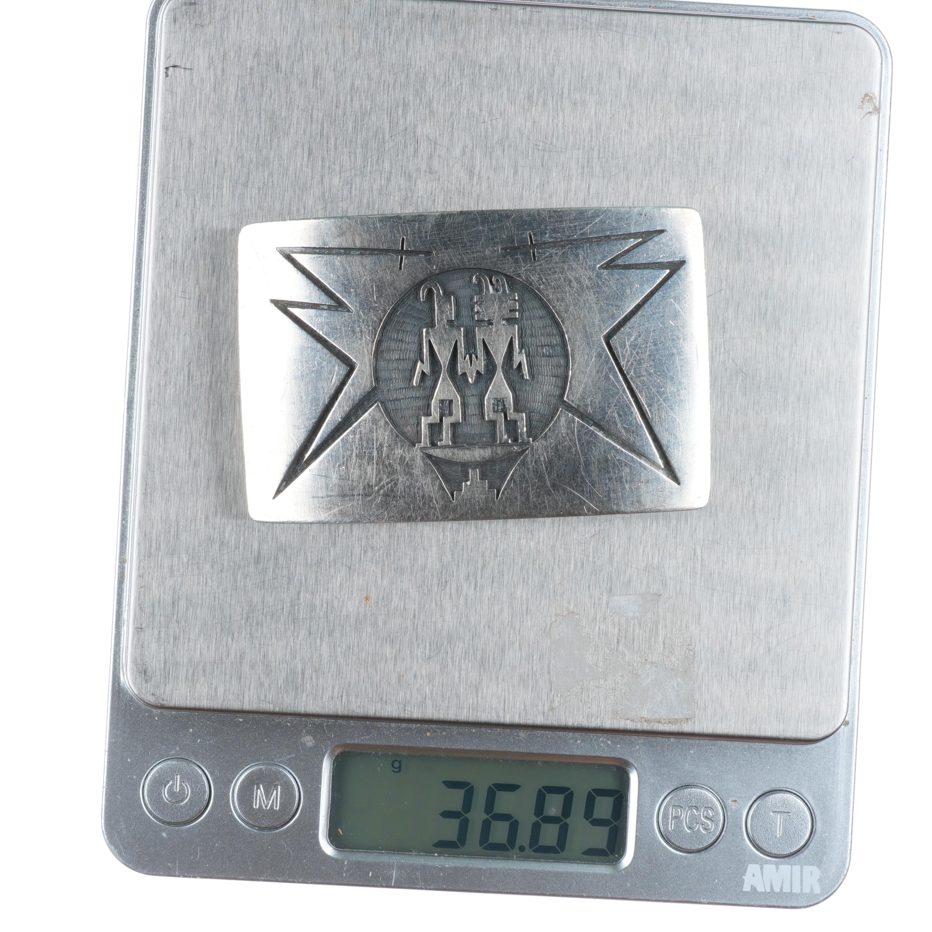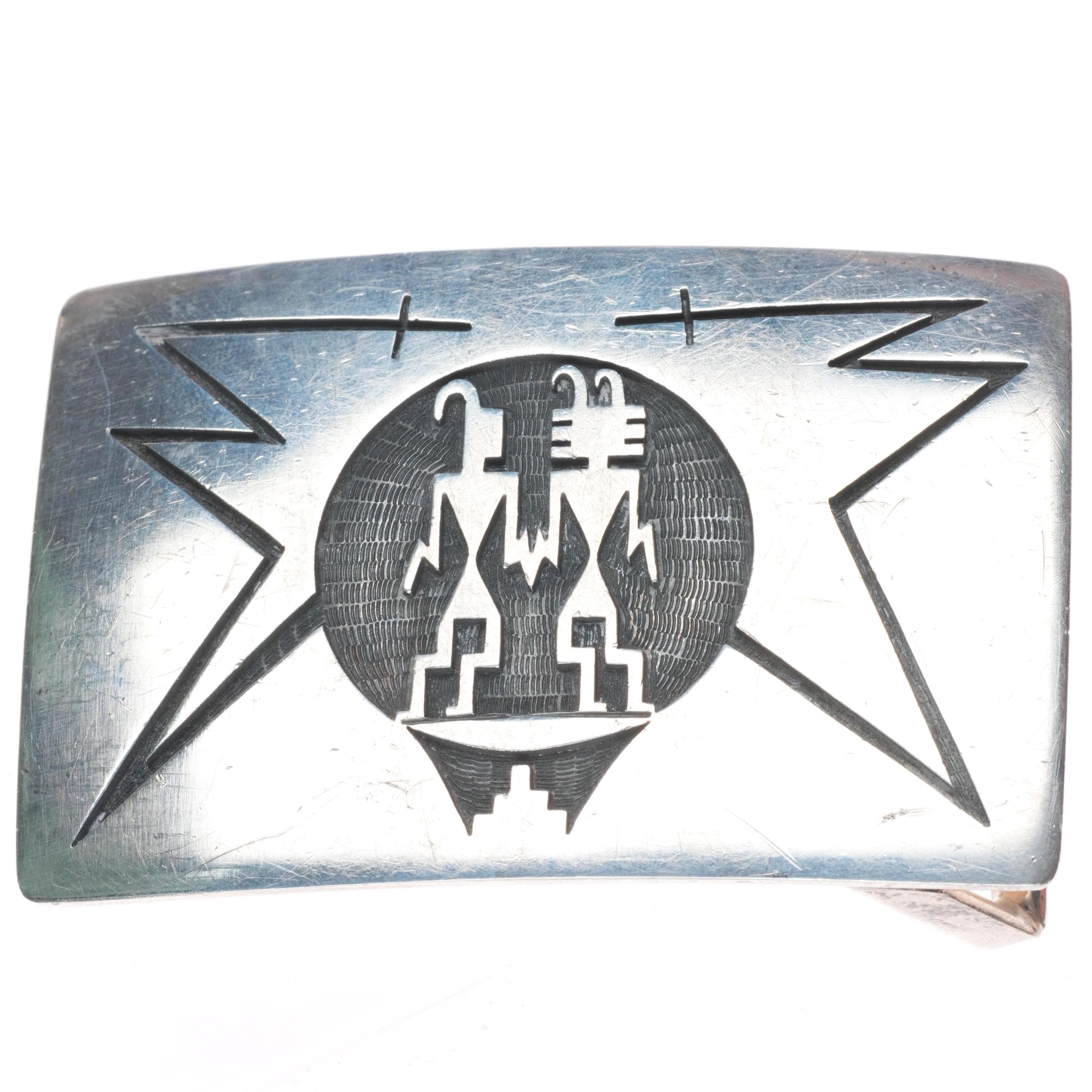 1.5" Raymond Kyasyousie Hopi overlay kachinas belt buckle sterling silver