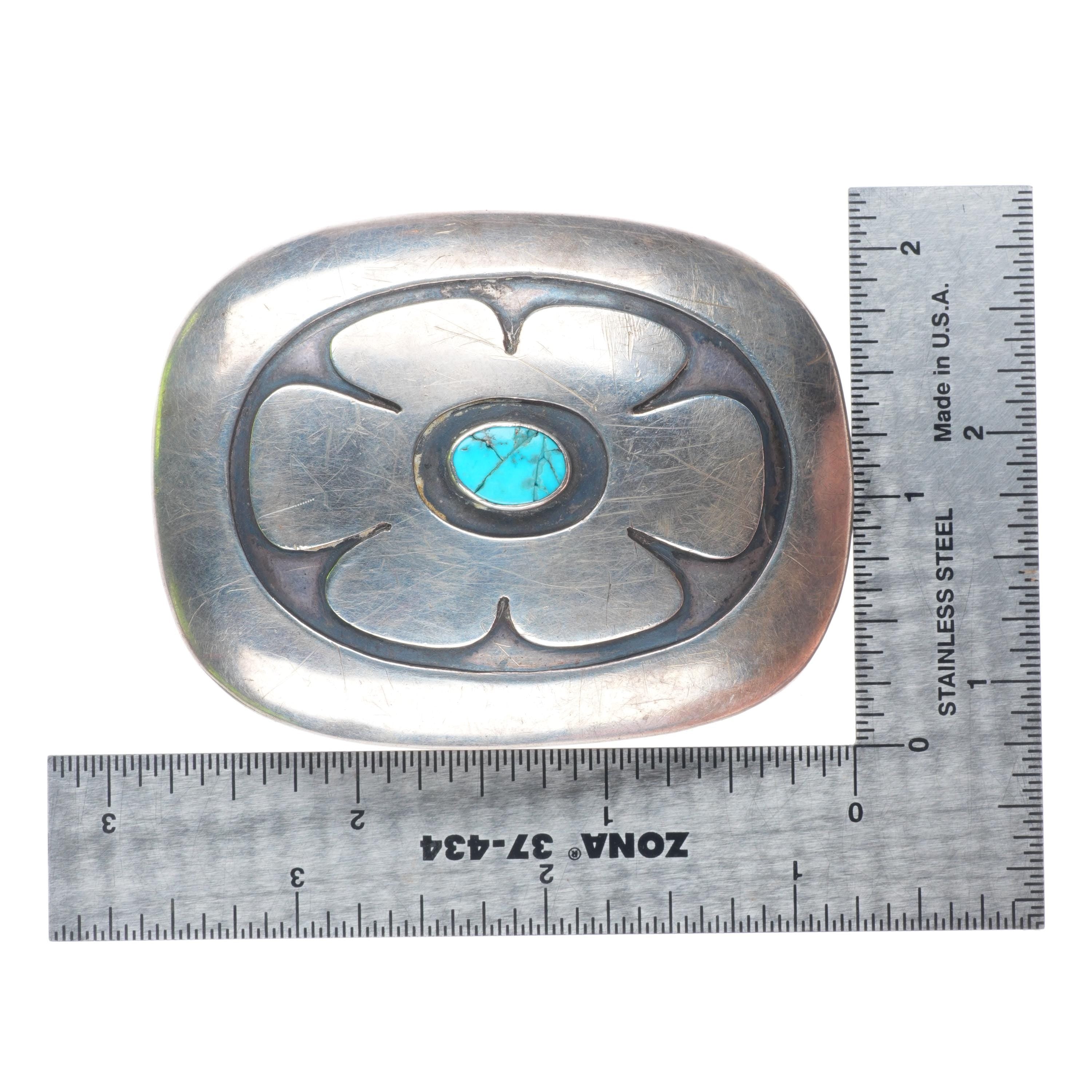 1" c1950's Hopi or Navajo sterling silver modernist turquoise belt buckle