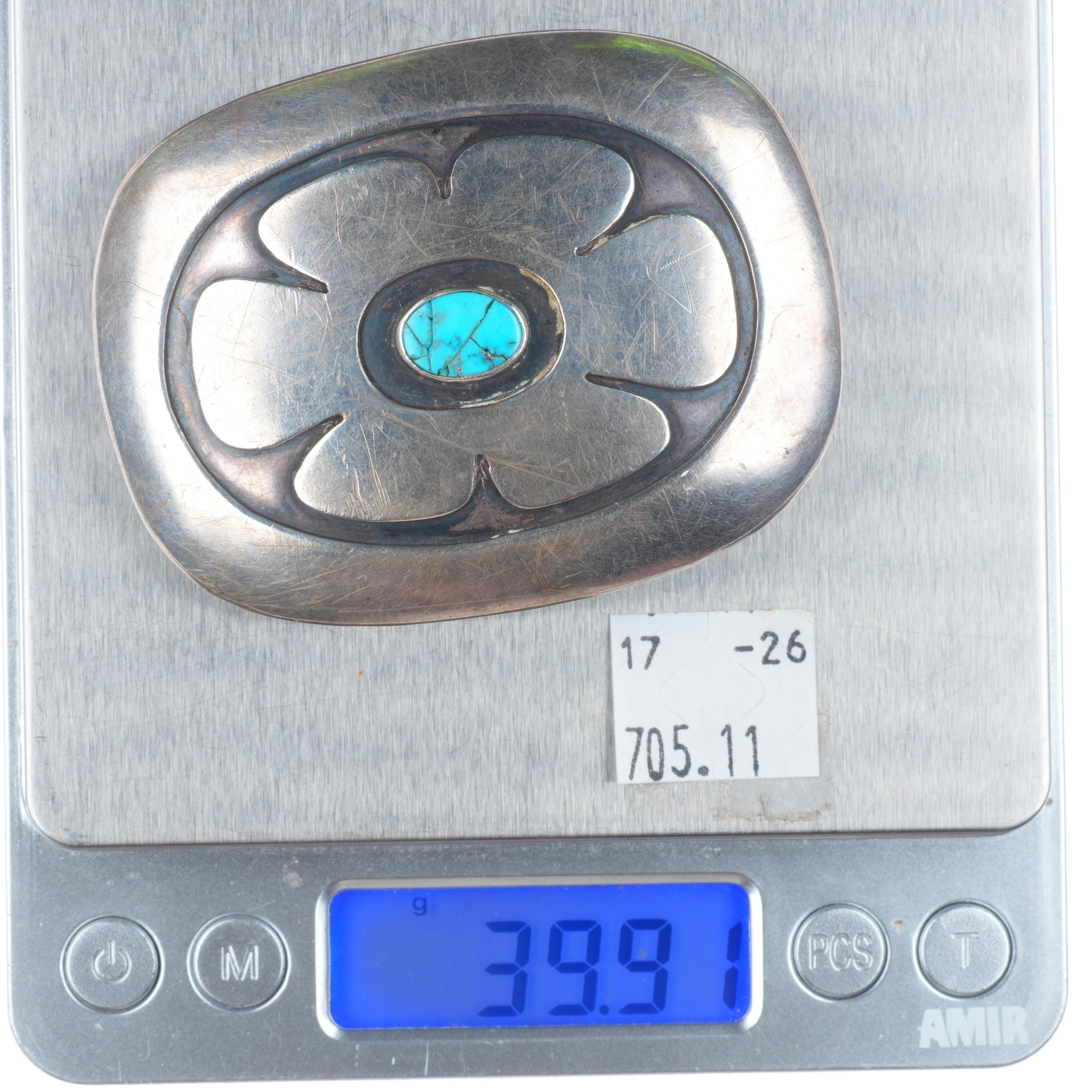 1" c1950's Hopi or Navajo sterling silver modernist turquoise belt buckle . Solid sterling silver (tested) with weight and measurements... Lesen Sie mehr