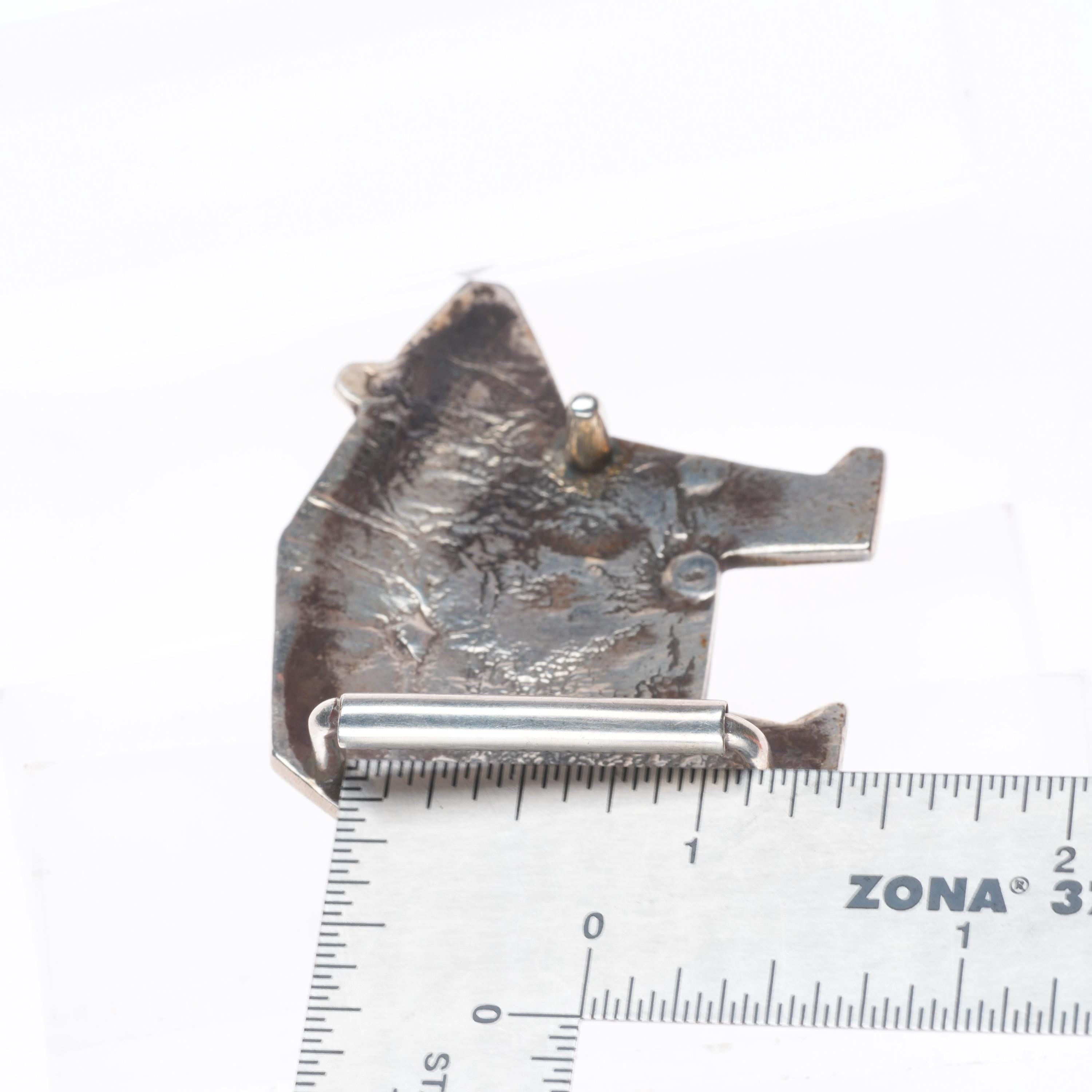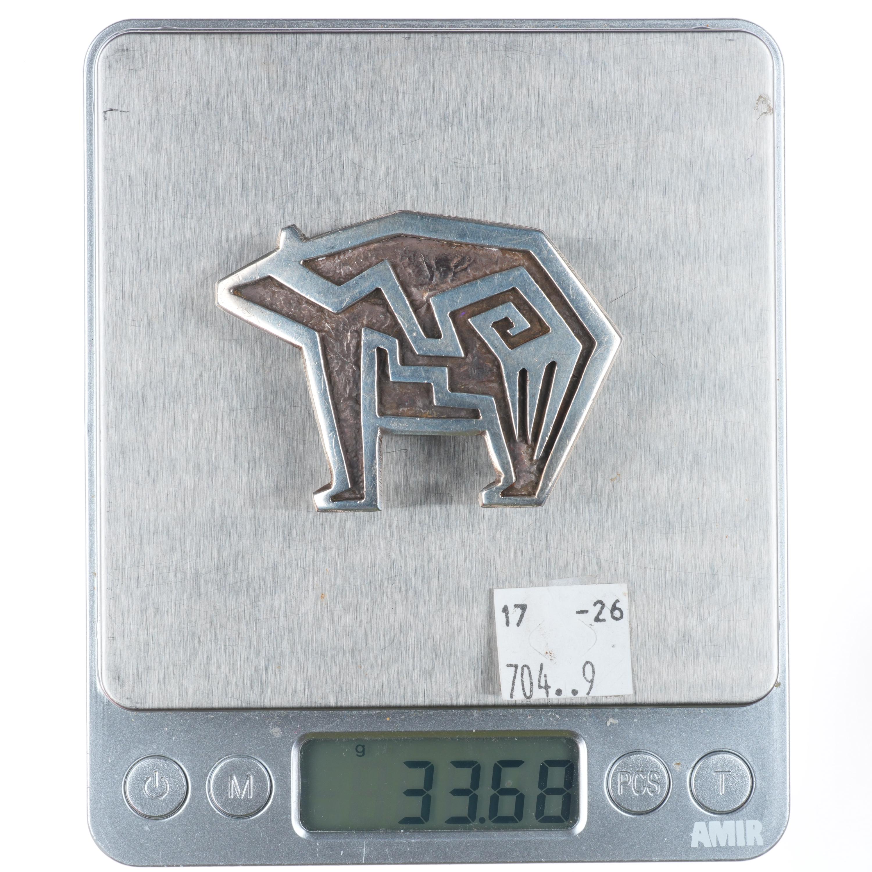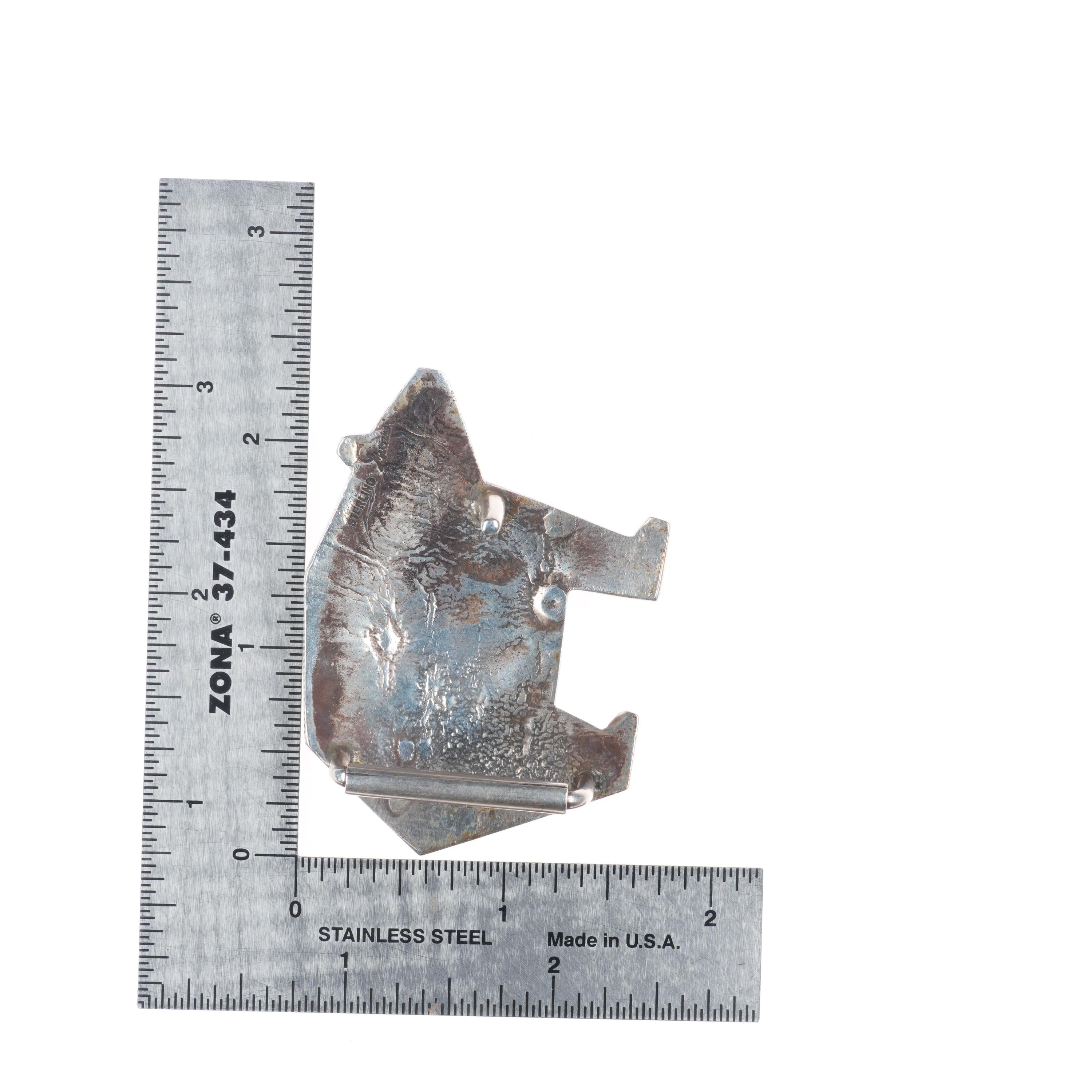 1" Duane Maktima Hopi sterling silver bear form belt buckle in overlay style. Solid sterling silver (tested) with weight and measurements in pictures.. Buckle fits a 1" belt. Circa last quarter of the 20th century.
