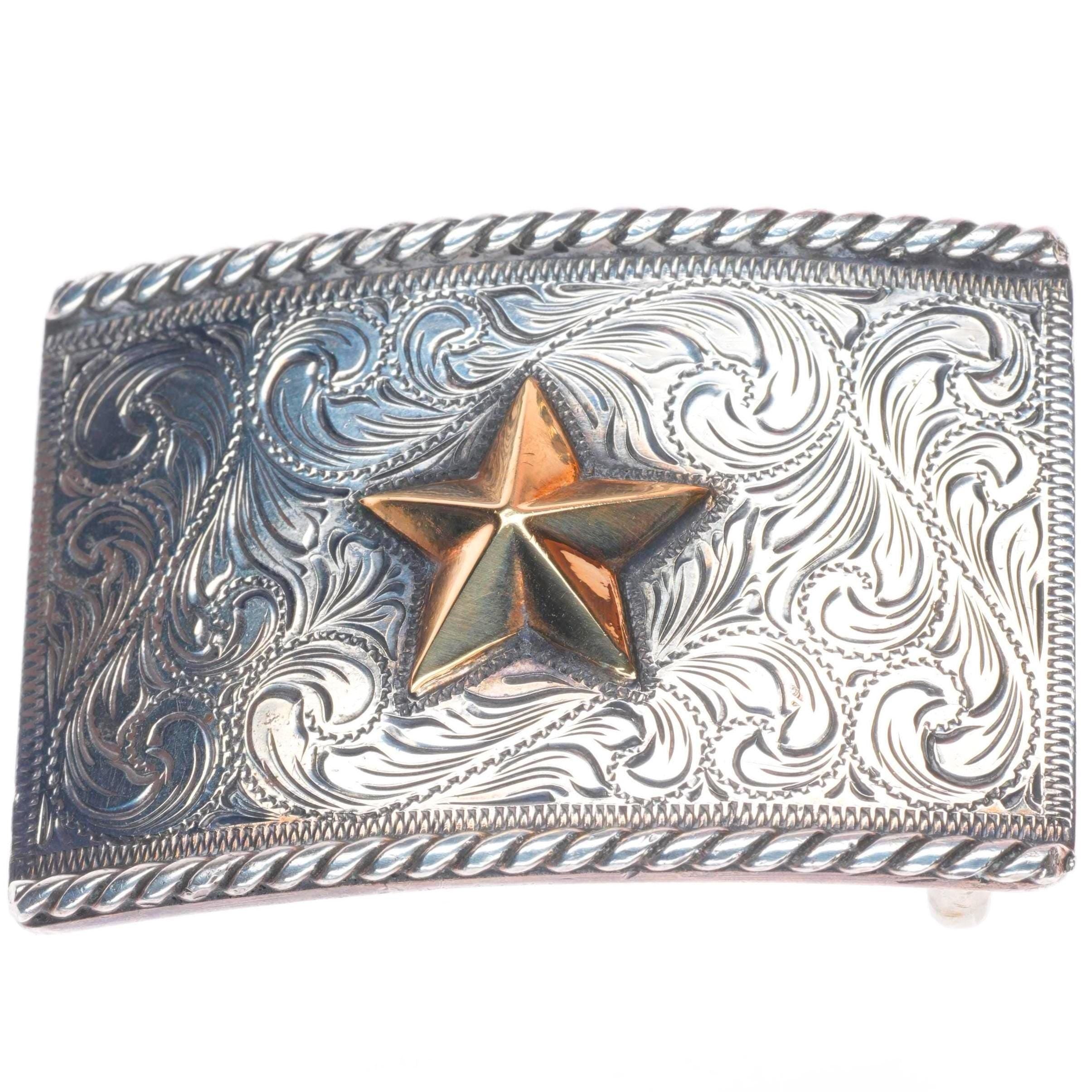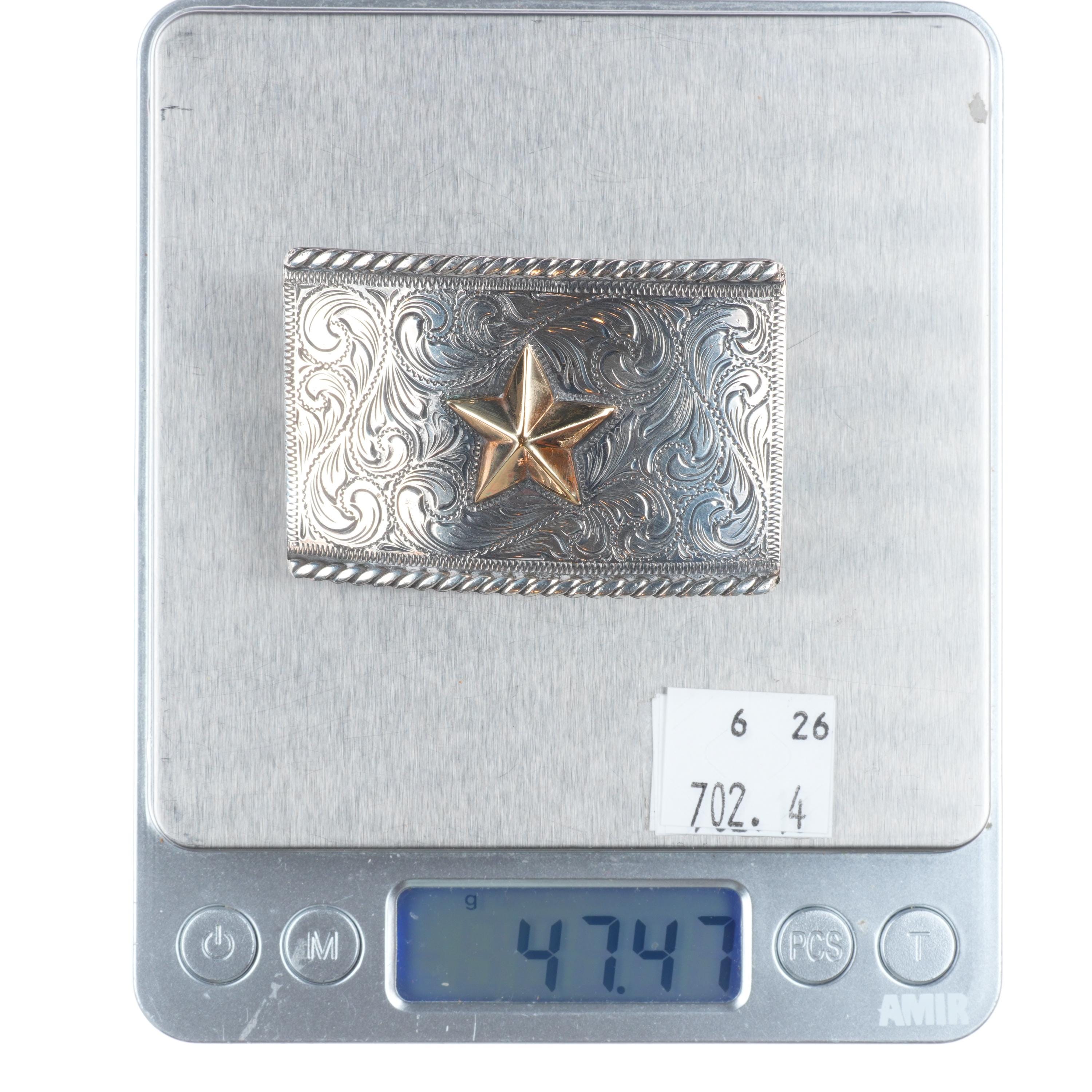 14k gold/sterling silver Hollywood classics Texas star hand engraved belt buckle . Tested and guaranteed solid sterling silver, solid 14k gold star, weight and measurements in pictures. Fully functional. All items will likely have some age appropriate/expected wear, the older they are the more wear they should have. Circa last quarter of the 20th century.. Fits up to a 1 1/8" belt