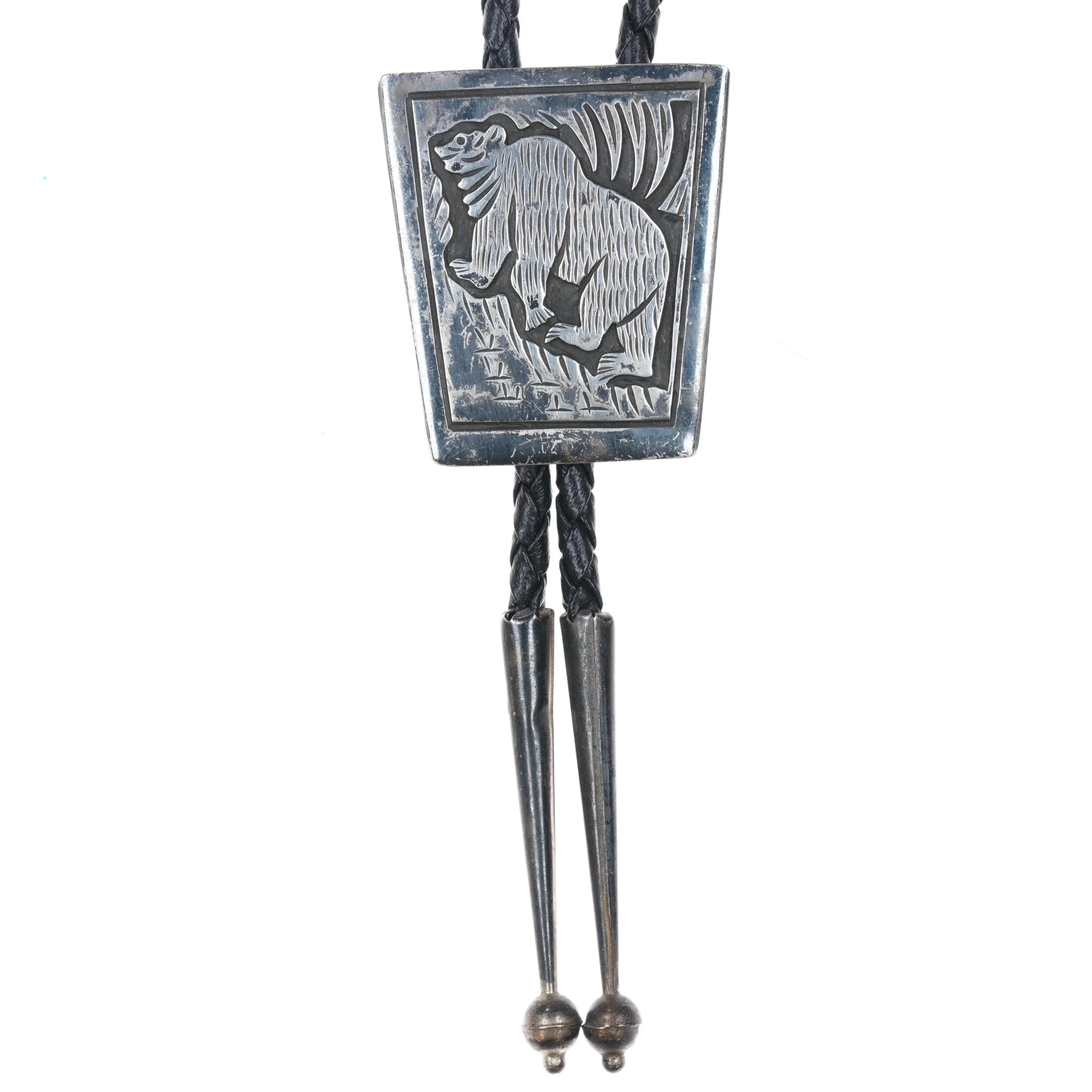 1970's Vintage Navajo sterling silver carved bear overlay bolo tie