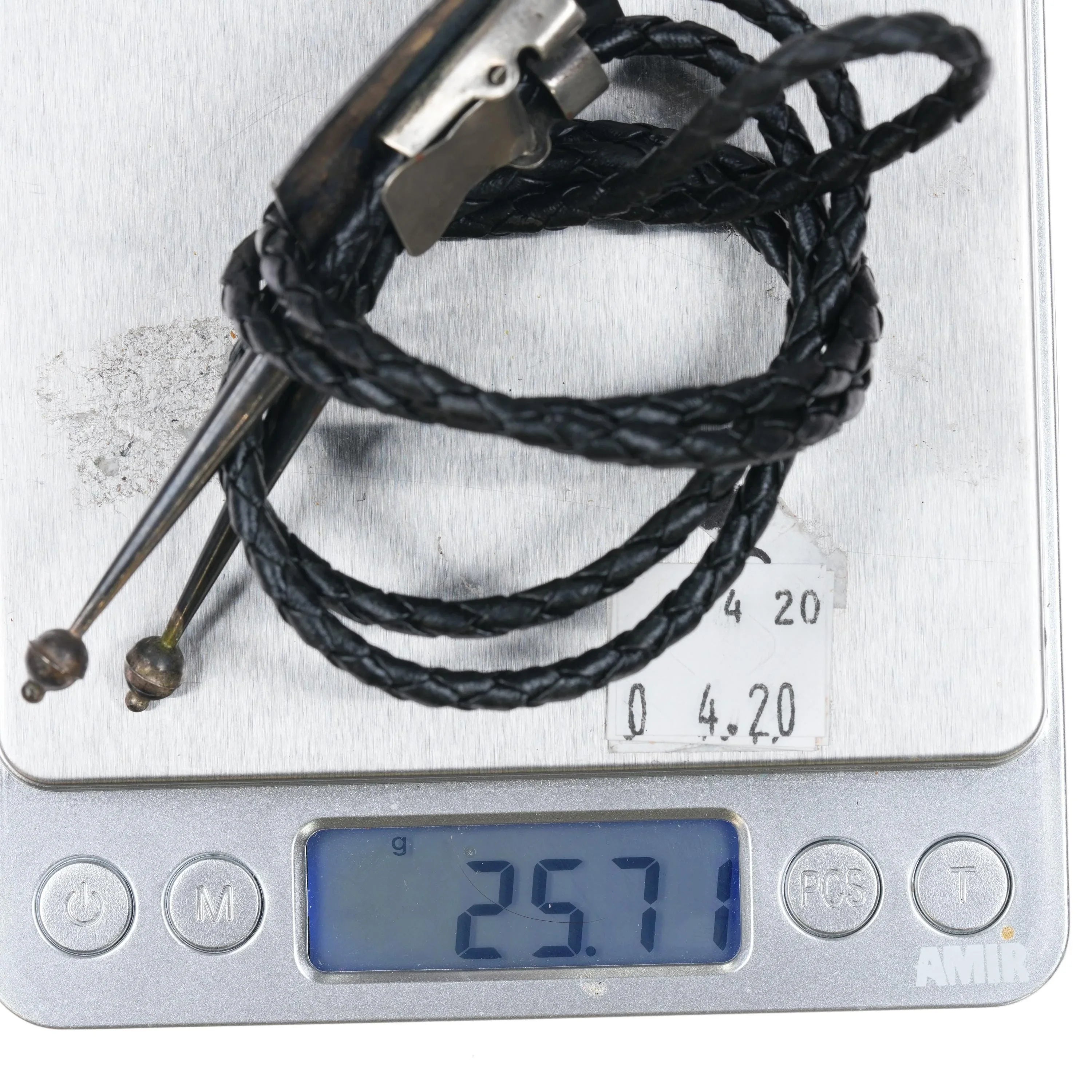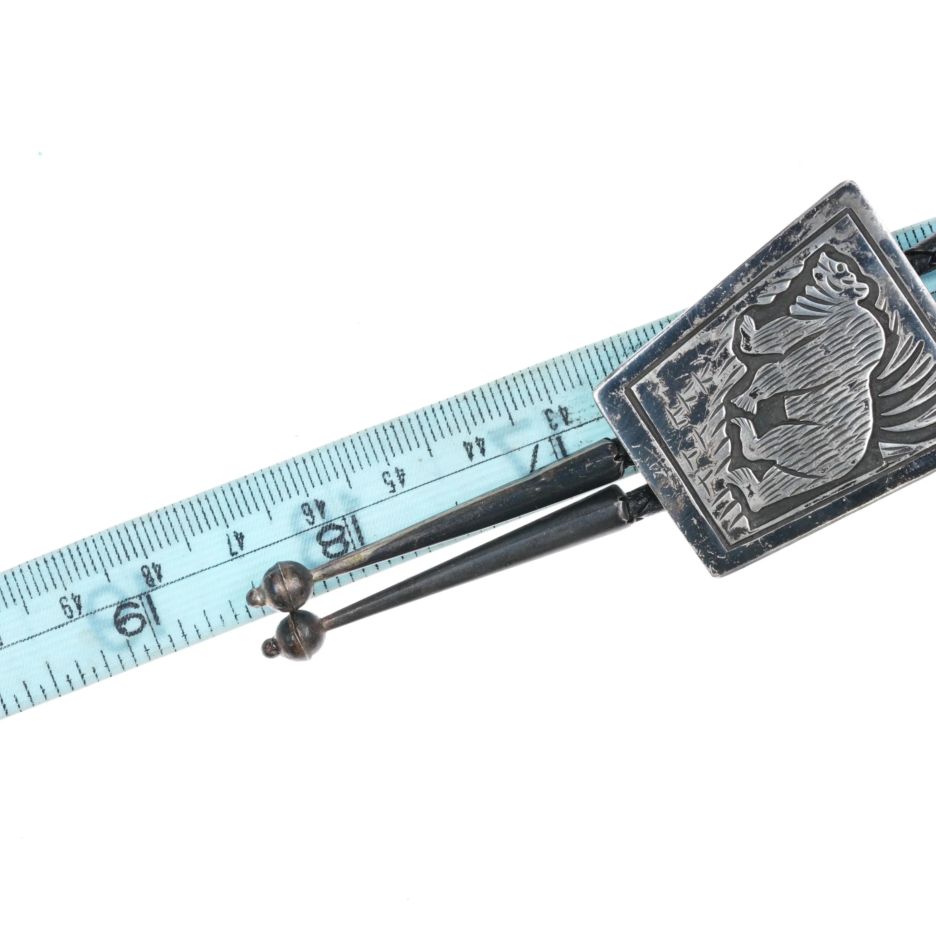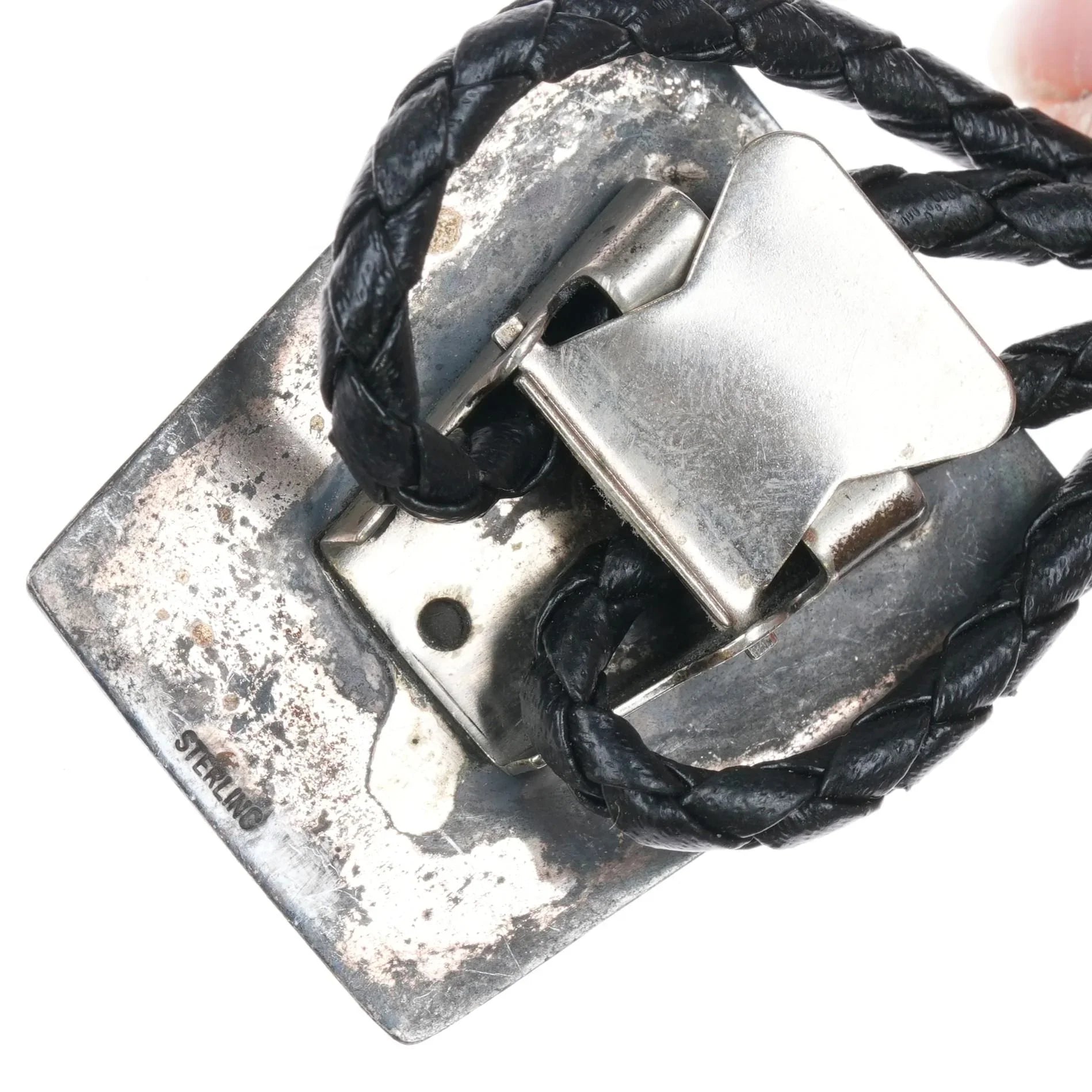 1970‘s Vintage Navajo sterling silver carved bear overlay bolo tie. Solid sterling silver slide and tips. Weight and measurements in pics. 37" long. Expected wear with no apparent damage. Weight shown is just the entire bolo, if there is a tray pictured it will be tared out of course. Unmarked other than STERLING.