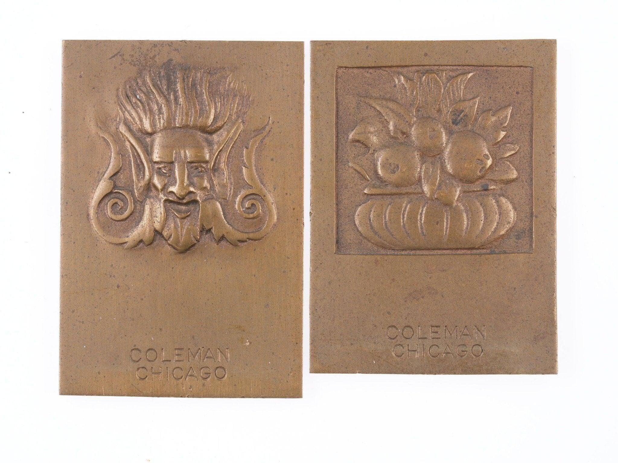 2 Plaketten/Markierungen aus Messing von Coleman Chicago aus dem Jahr 1910. Größte 3" x 2", garantierte Antiquitäten aus dem ersten Viertel des 20. Jahrhunderts. Wahrscheinlich irgendeine Art von Gebäudemarkierung, möglicherweise Versicherungsfeuermarkierung. Um die Jahrhundertwende waren in Chicago einige Coleman-Unternehmen tätig. Einer stellte Peanut-Maschinen her, ein anderer Hardware/Feuerdüsen, ein anderer war ein früher Partner in American Flyer-Zügen. Verkaufe beides