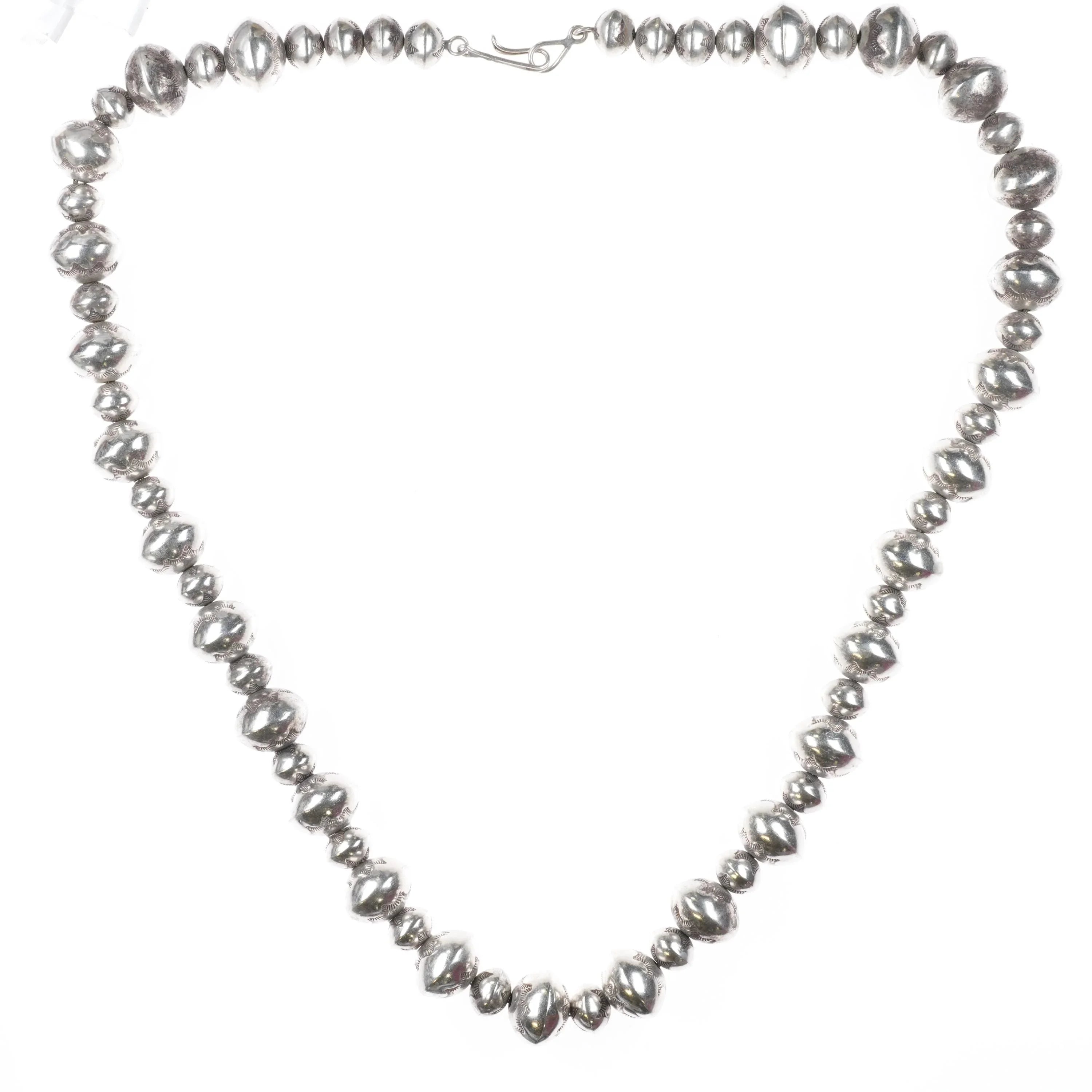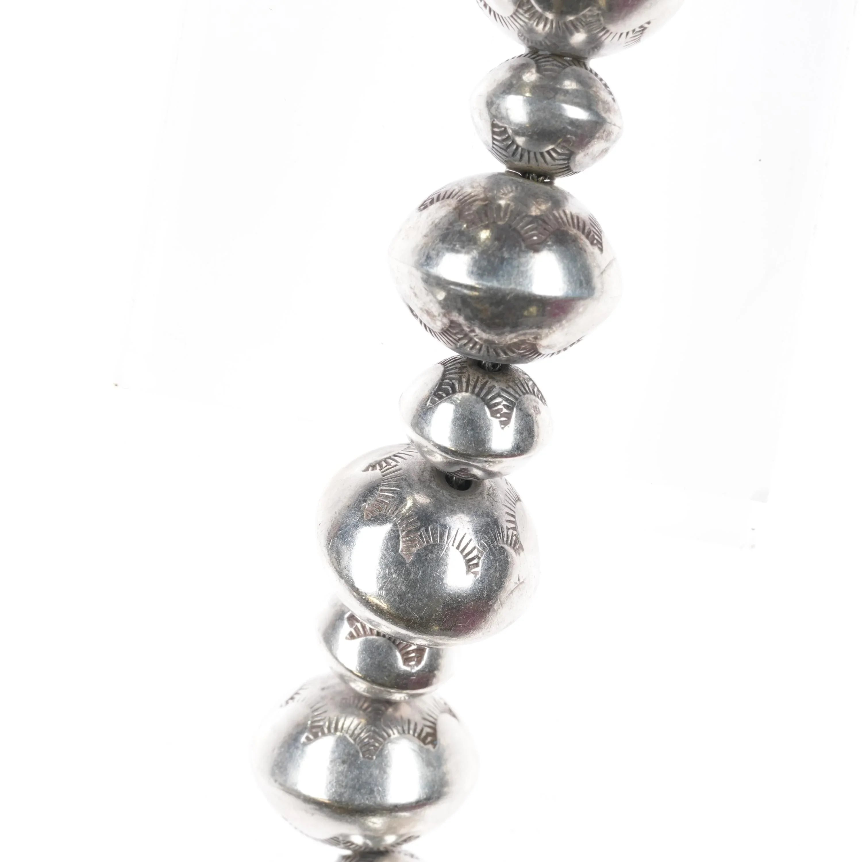 29" Large Navajo Pearls hand stamped sterling silver graduated beaded necklace. Solid sterling silver, unmarked, with weight and measurements in the pictures. Tested and guaranteed solid sterling silver. No damage.