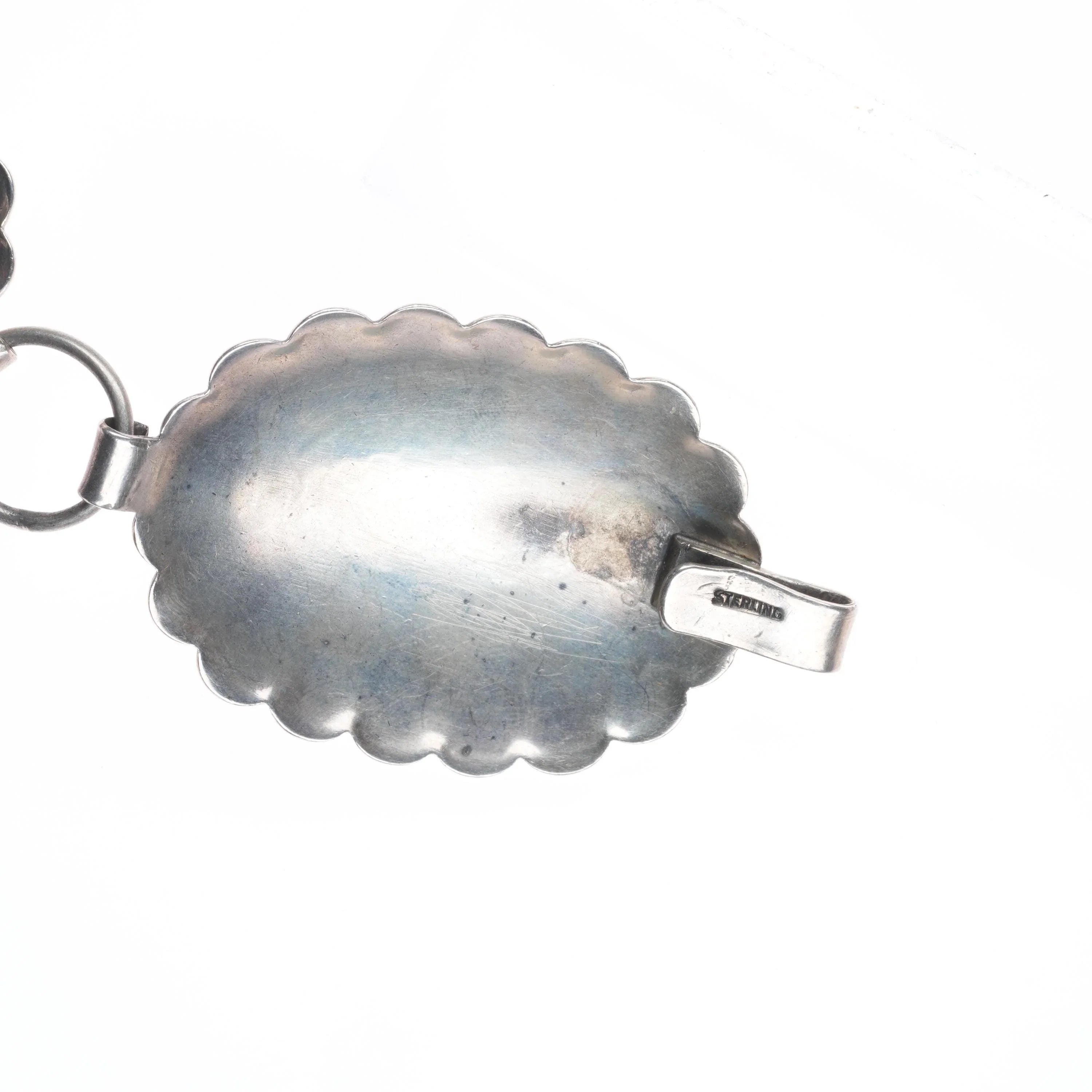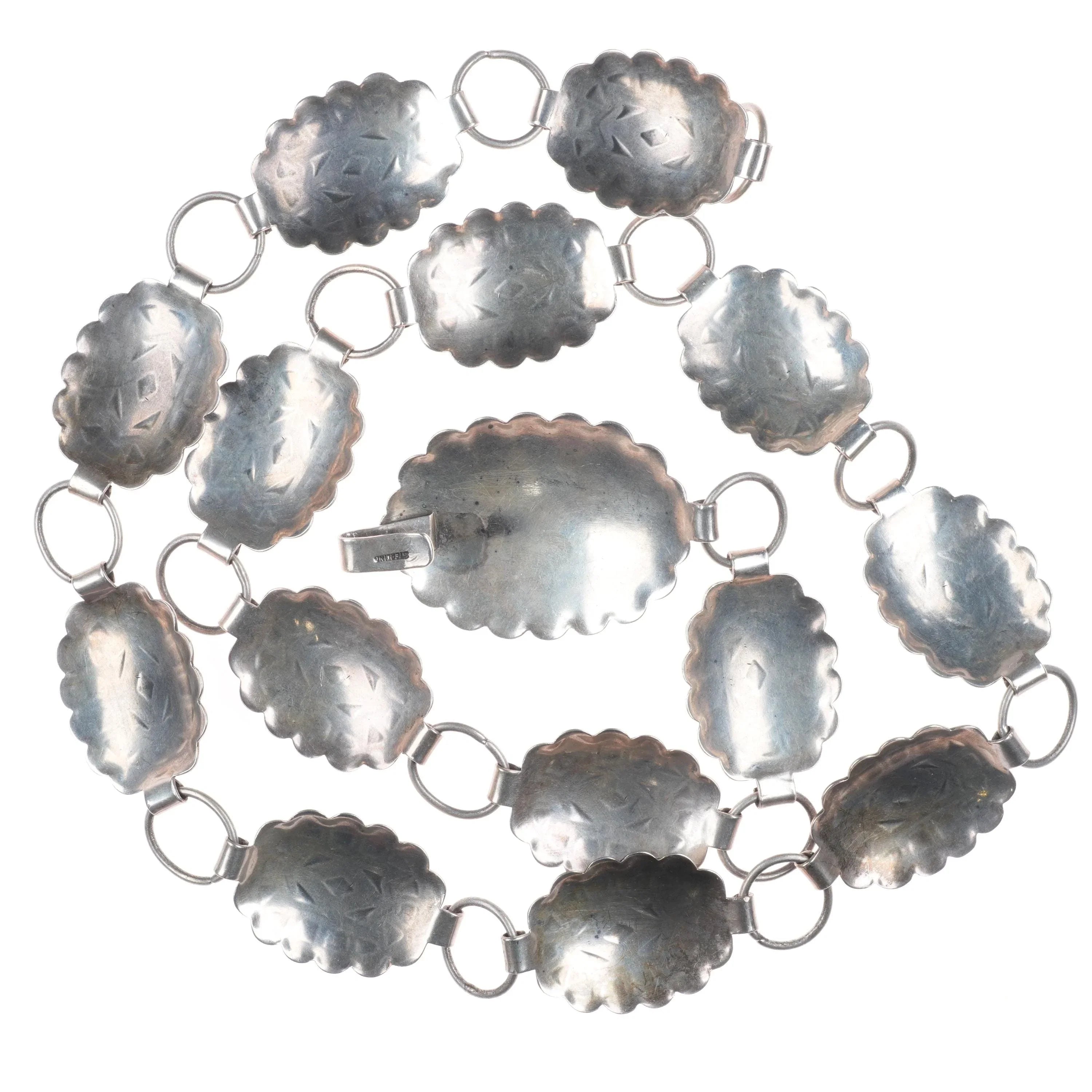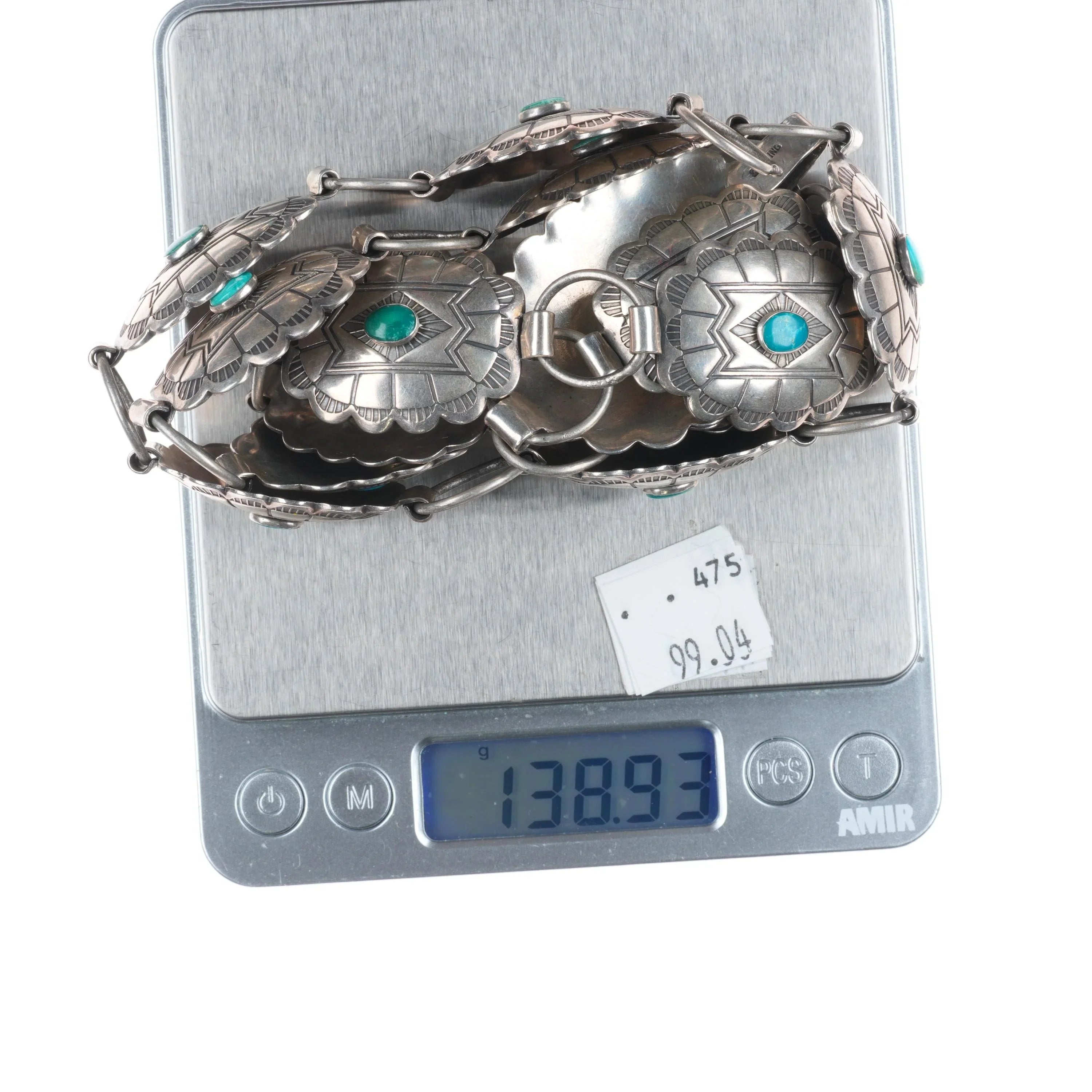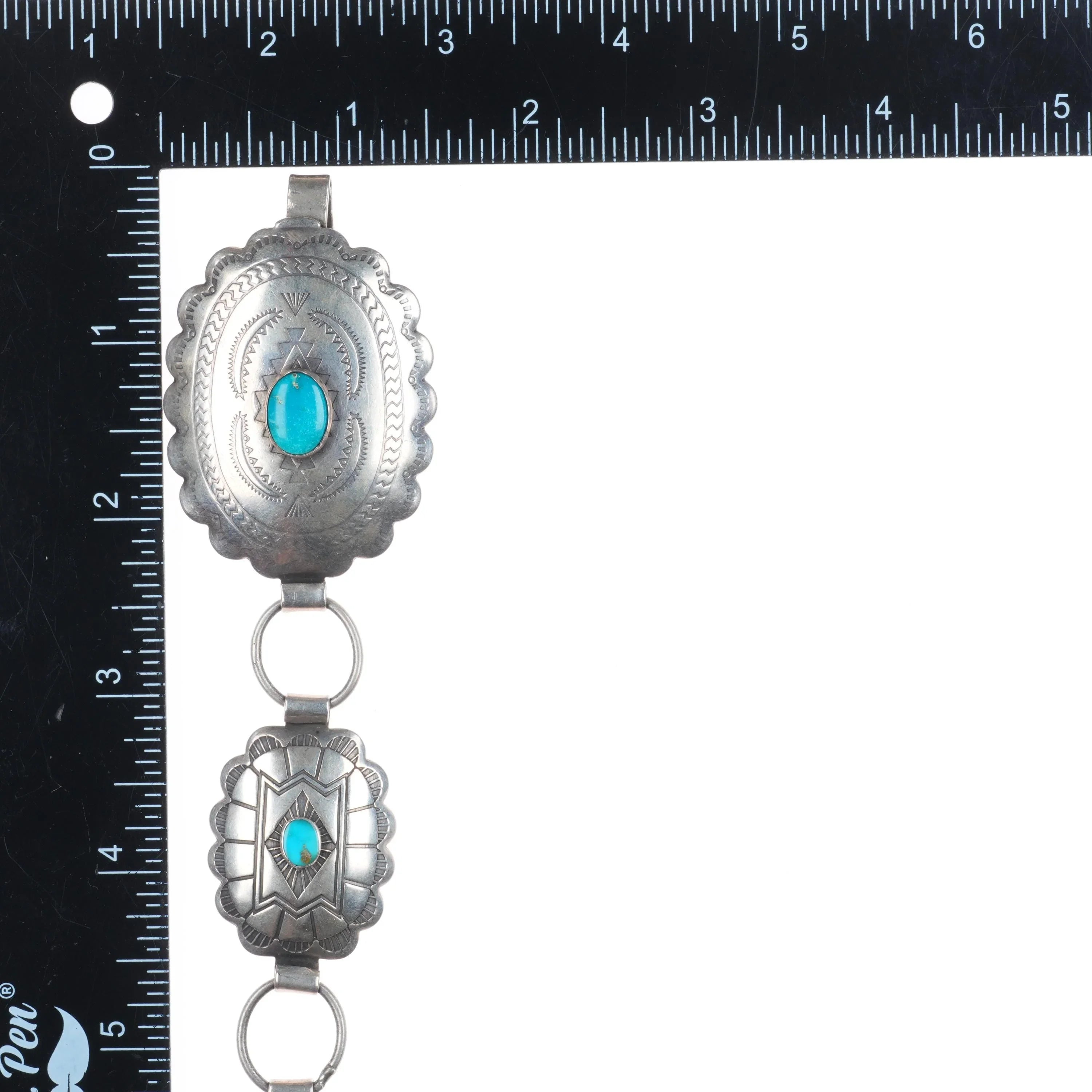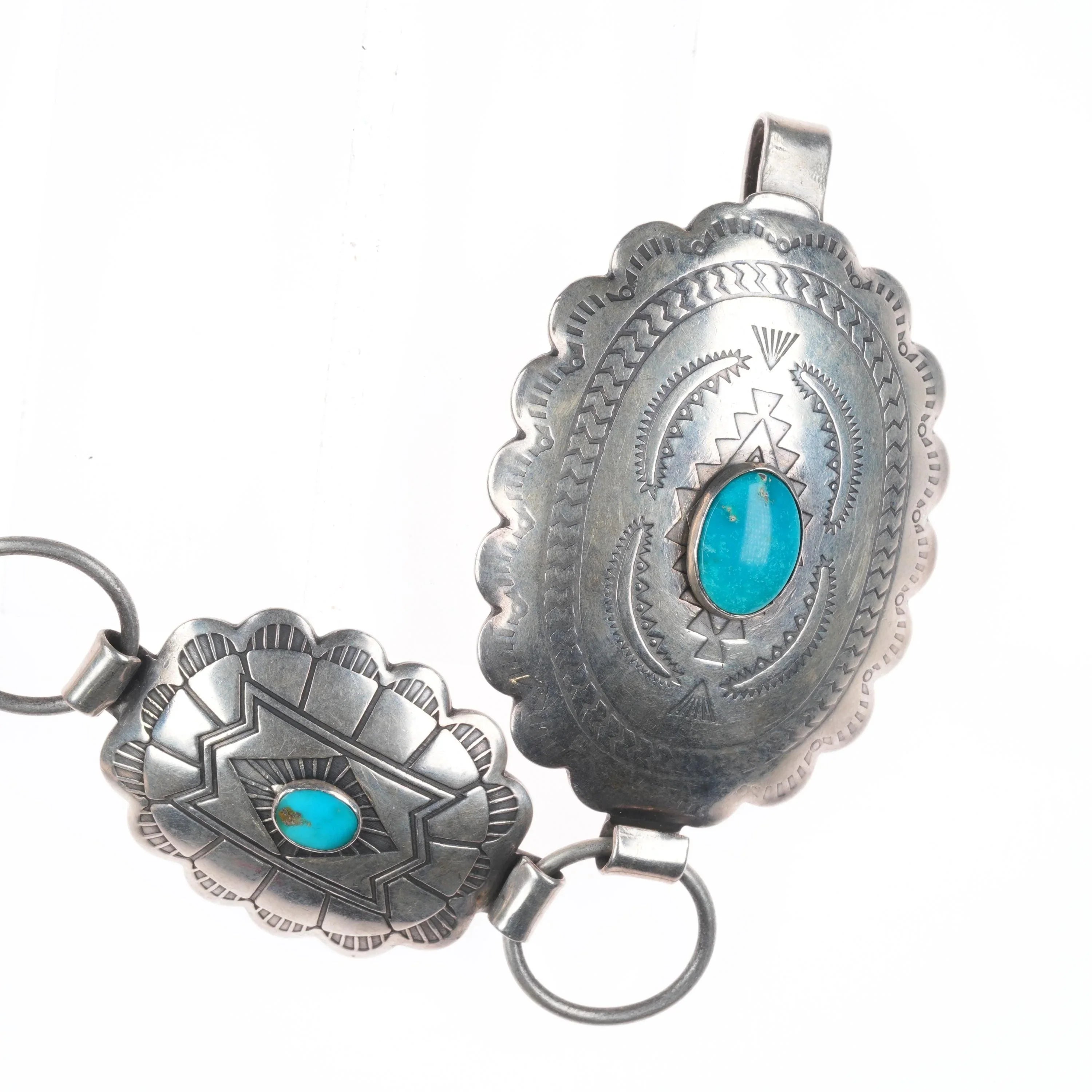 33" 40‘s-50‘s Fred Harvey Natural turquoise sterling silver concho belt. Tested and guaranteed sterling silver. Weight and measurements in pictures. Will fit up to a 33" waist but can be hooked anywhere shorter. Nice, natural American turquoise that could be from a number of mines. Circa mid 20th century.