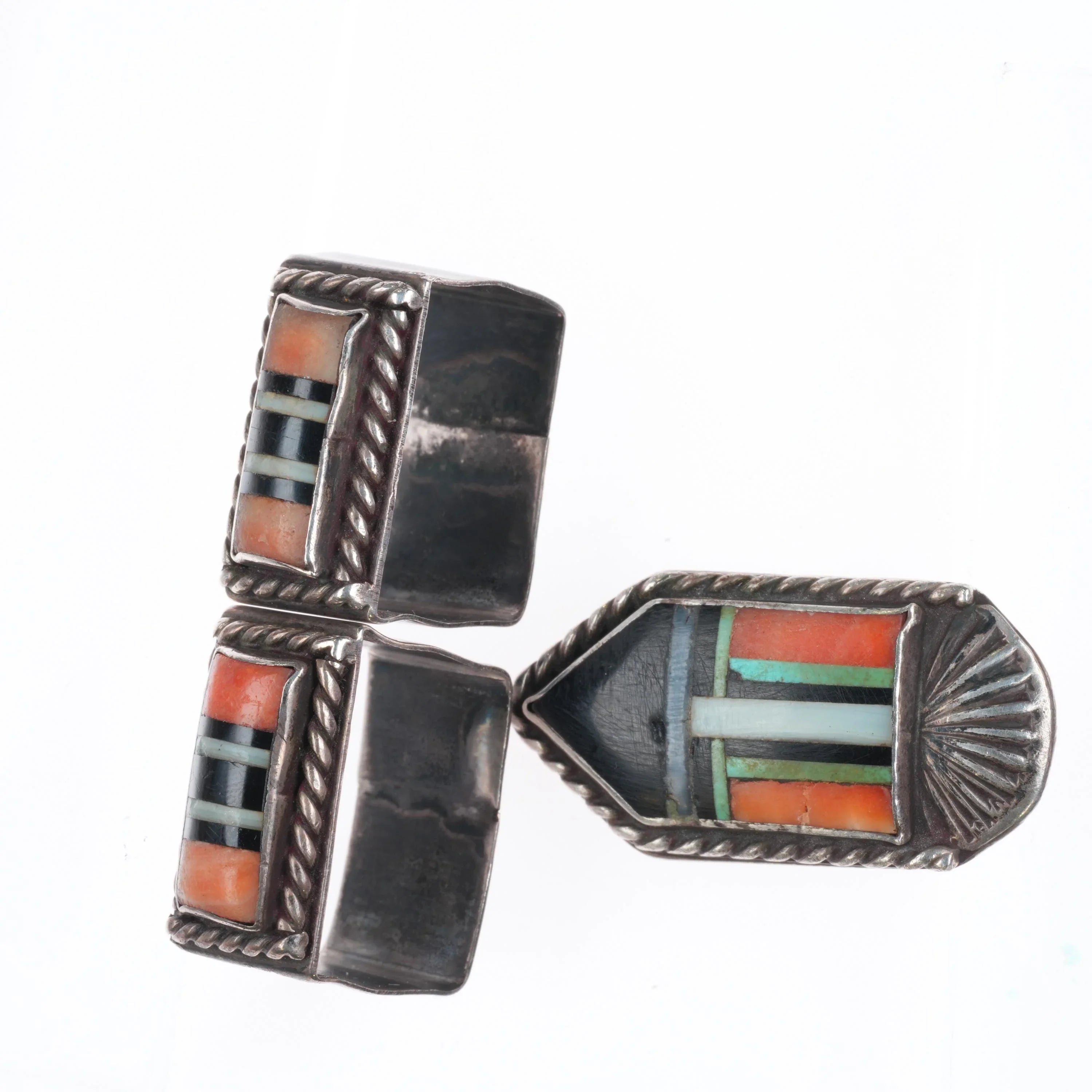 40‘s-50‘s Vintage Zuni sterling silver multi-stone inlay ranger belt buckle set Fits up to a 3/4" belt. Tested and guaranteed solid sterling silver with weight and measurements in pictures. Fully functional. Stones are secure with no damage. All items will likely have some expected wear, the older they are the more wear they should have. Circa mid 20th century.