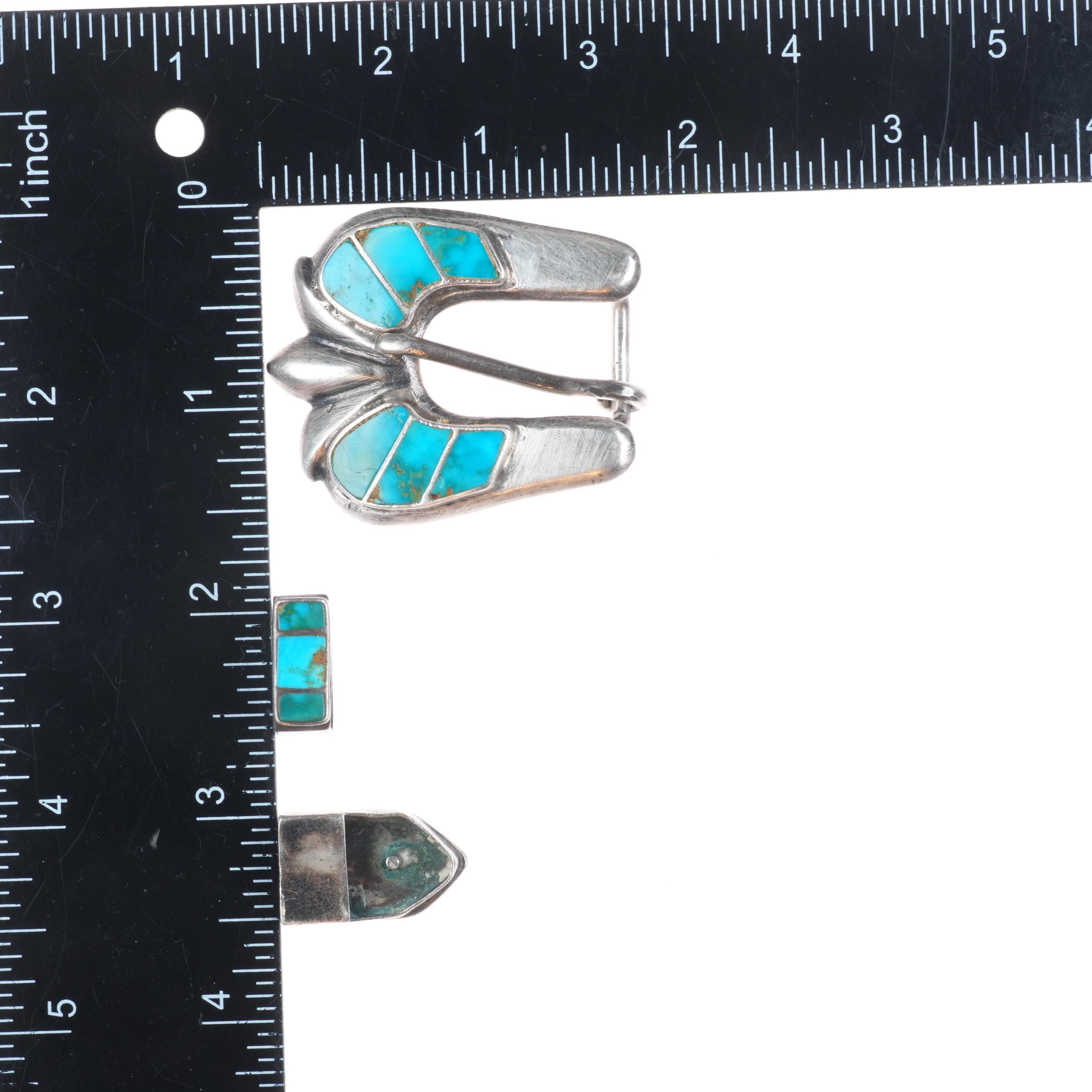 40‘s-50‘s Zuni Blue Gem Turquoise sterling silver 5/8" ranger belt buckle set. Solid sterling silver (tested) with weight and measurements in pictures.. Fits a 5/8" belt. No issues, some expected wear. Ranger belts are typically wider and taper down to 5/8" where the buckle and tip go on.