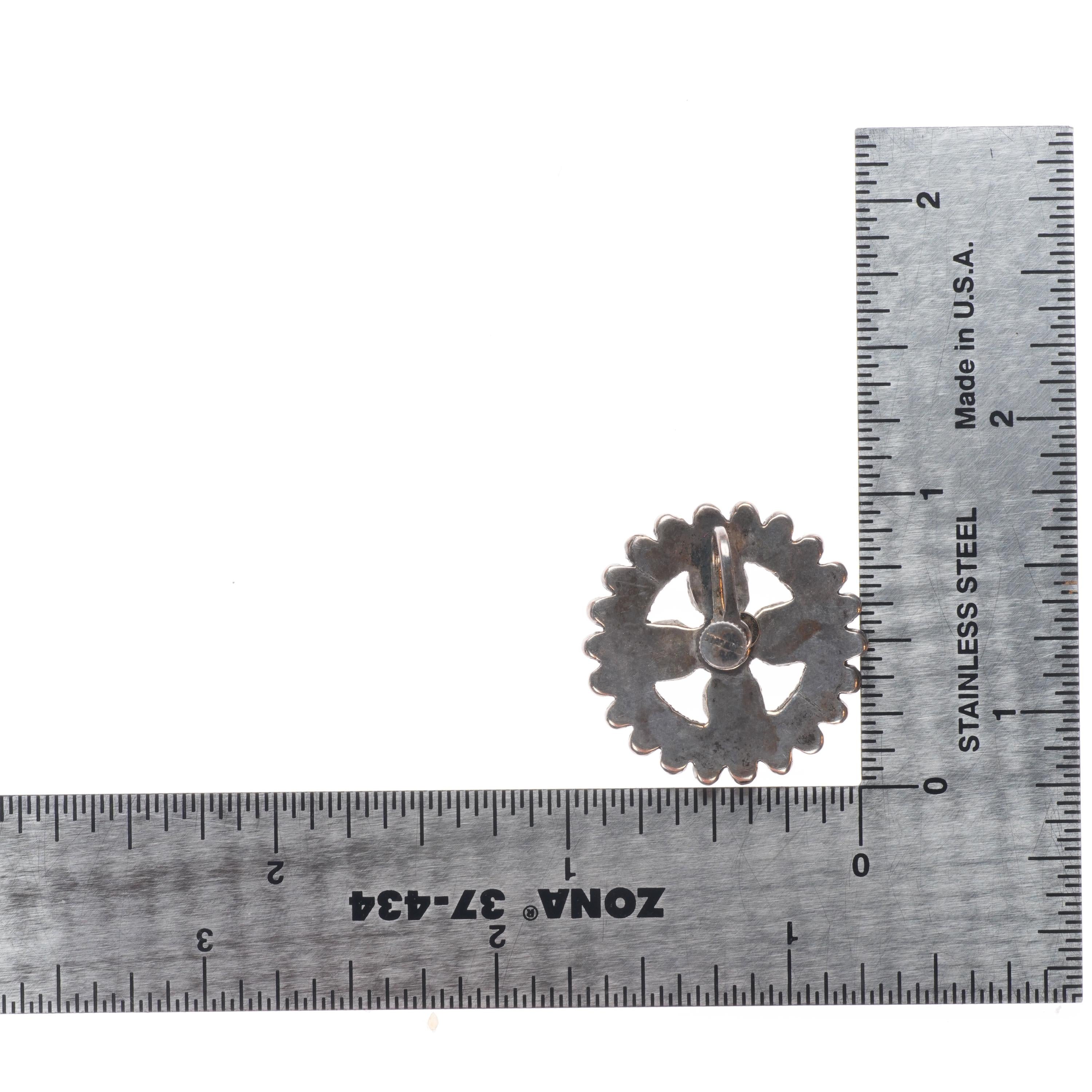 40‘s-50‘s Zuni petit point turquoise wagon wheel sterling silver screw earrings. Great earrings with no issues, tested and guaranteed solid sterling silver and copper, any marks detected, weight, and measurements will be shown in the pictures. Circa mid 20th century. Apparently unmarked.