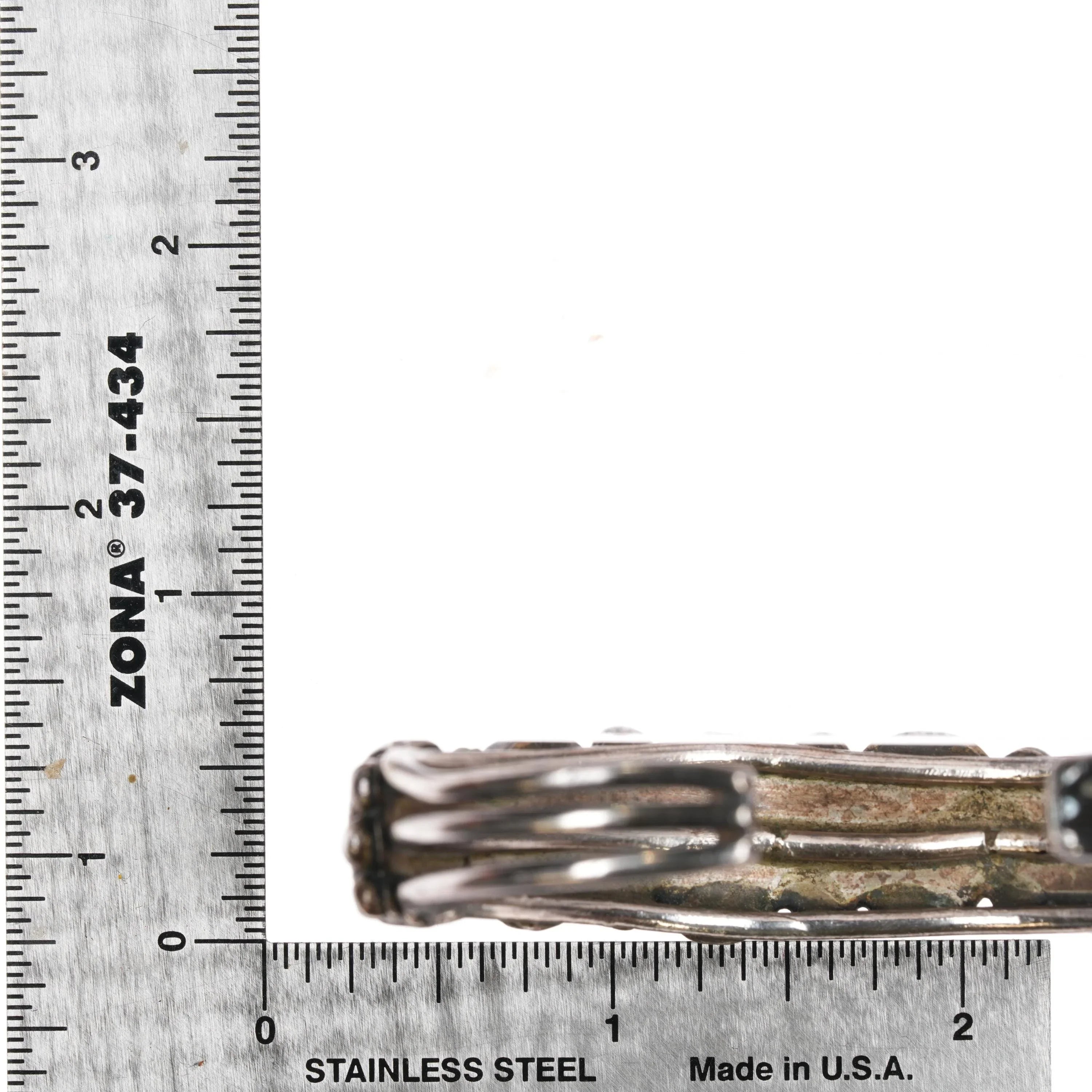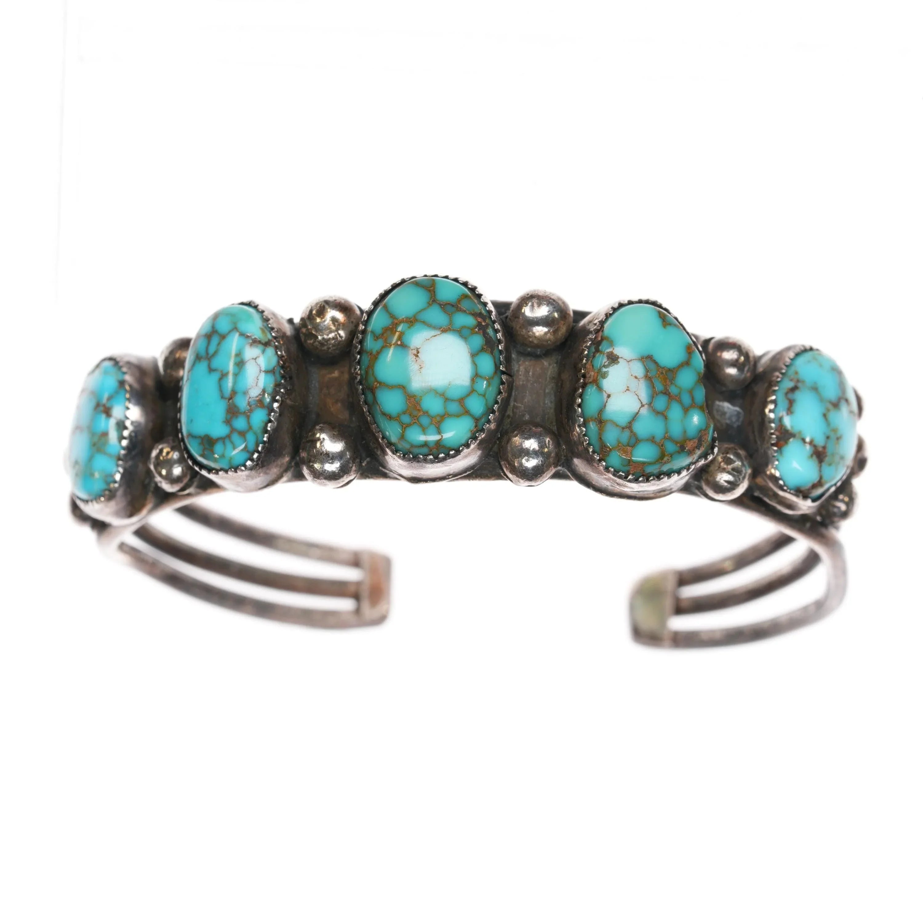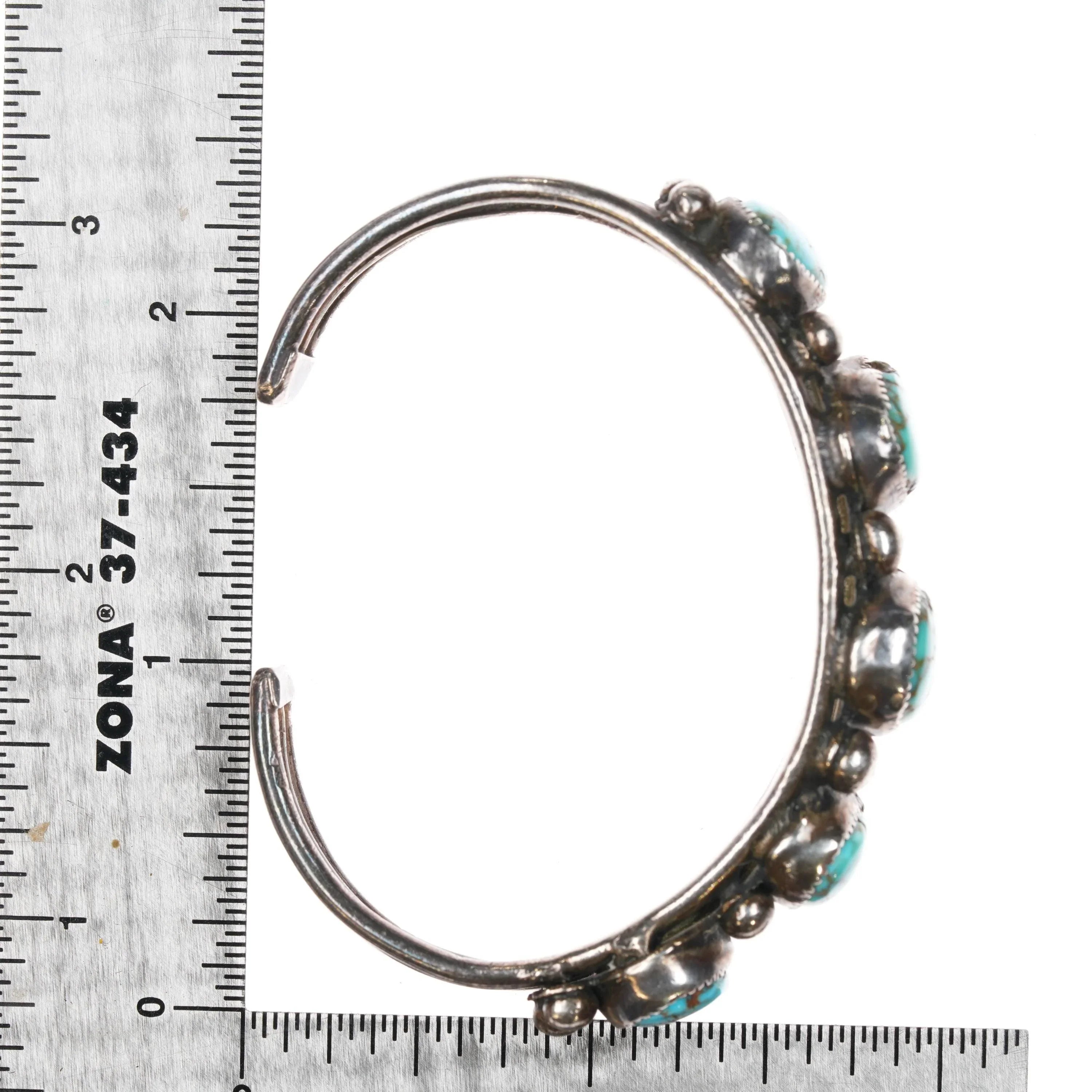 5.75" c1930‘s Navajo ingot silver Indian Mountain turquoise row cuff bracelet. Solid sterling silver. Will fit up to a 5.75" wrist, gap size and other measurements in pictures. Nice, well made bracelet. Very rare and high grade natural American turquoise from Nevada. Likely Lone Mountain or Indian Mountain. One stone with chip on side and bezel conforming to it. I have know way of knowing if it started off this way 90 or so years ago or not.