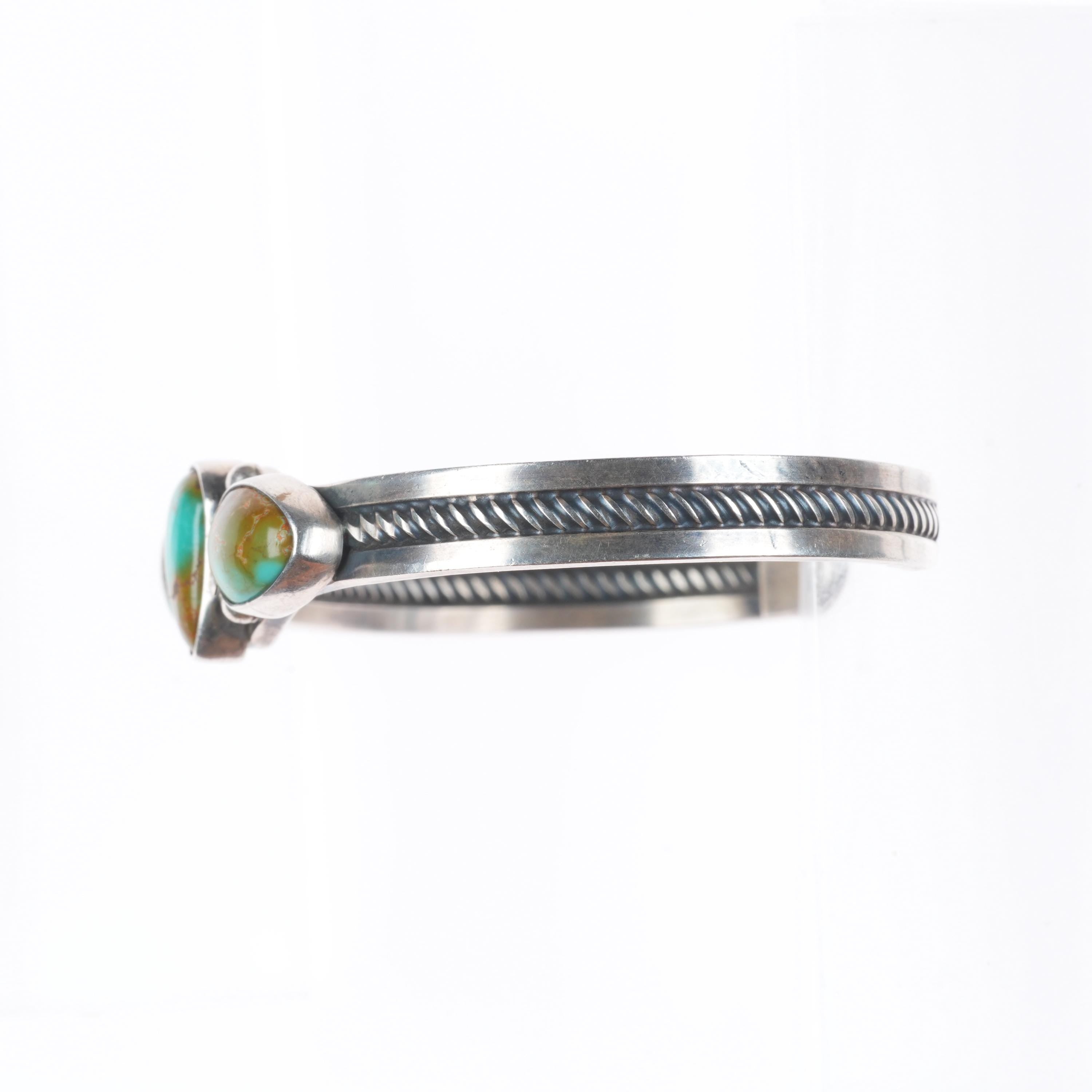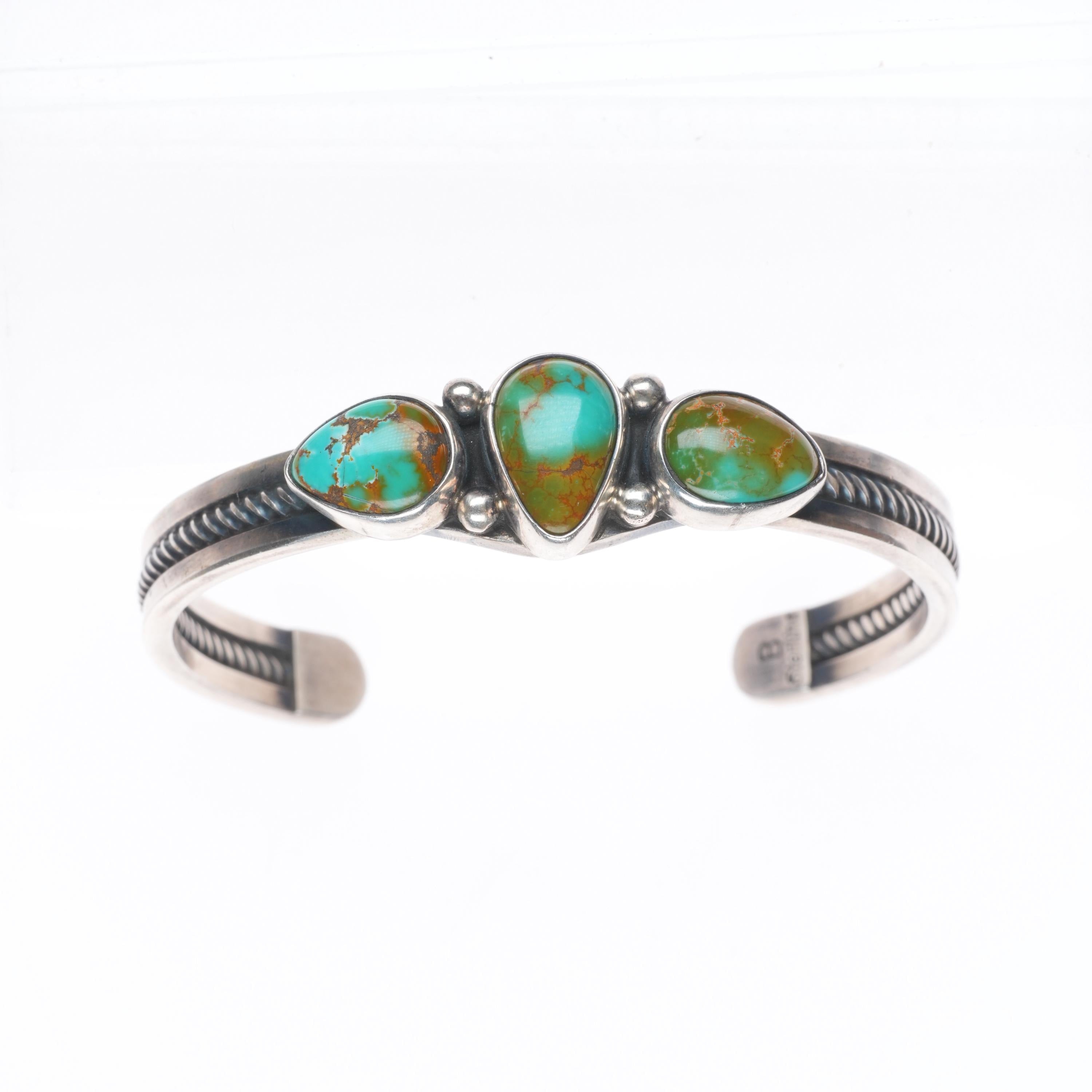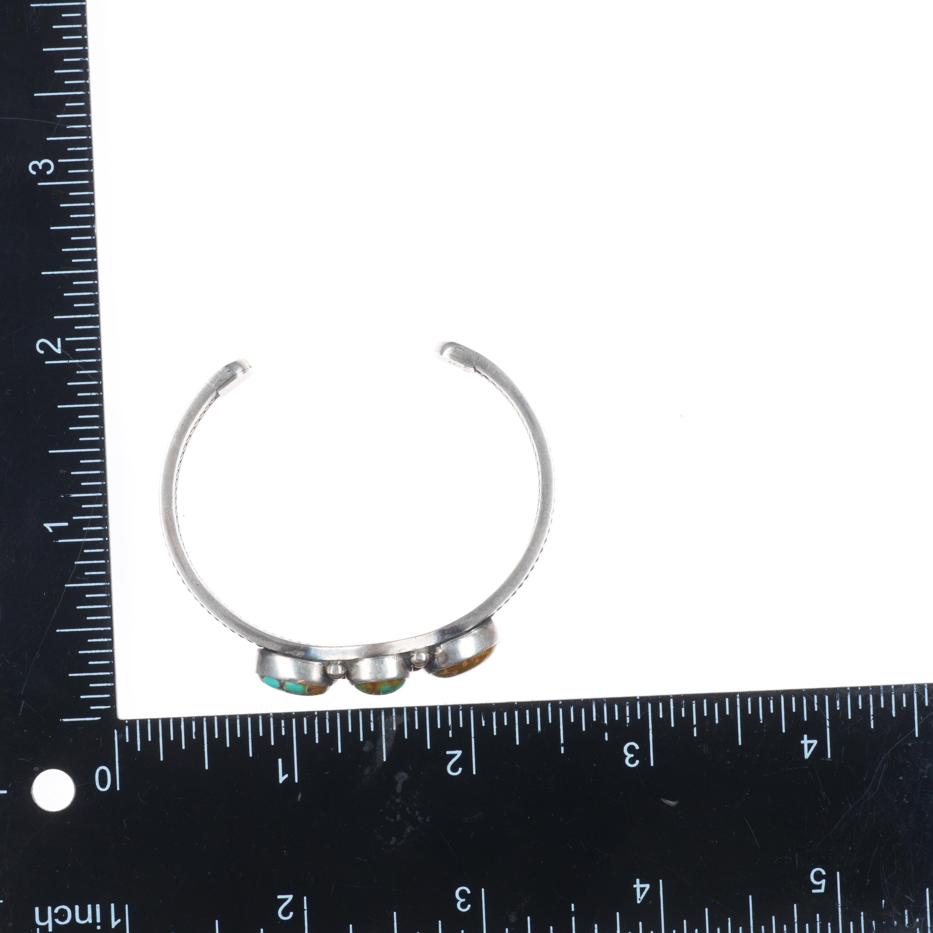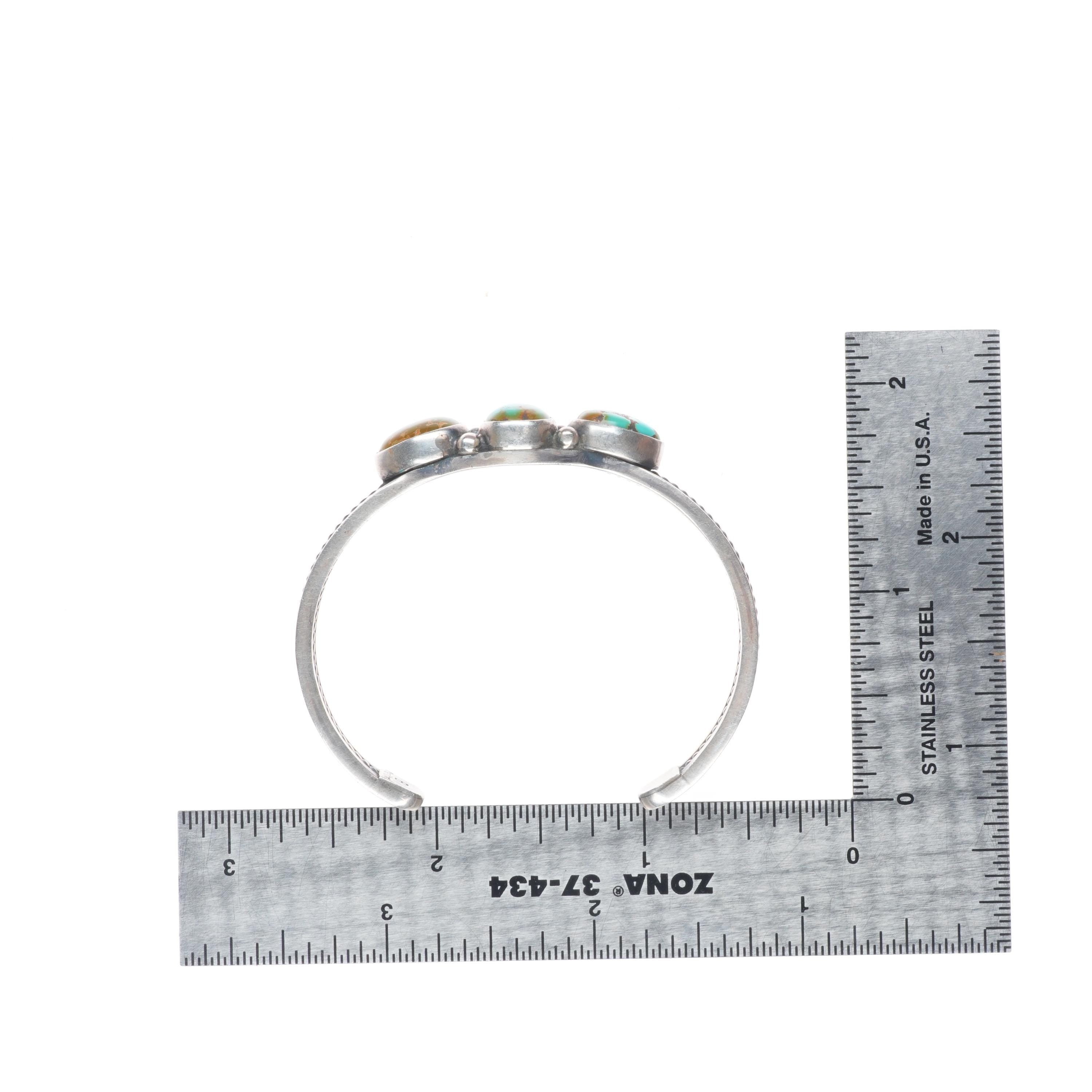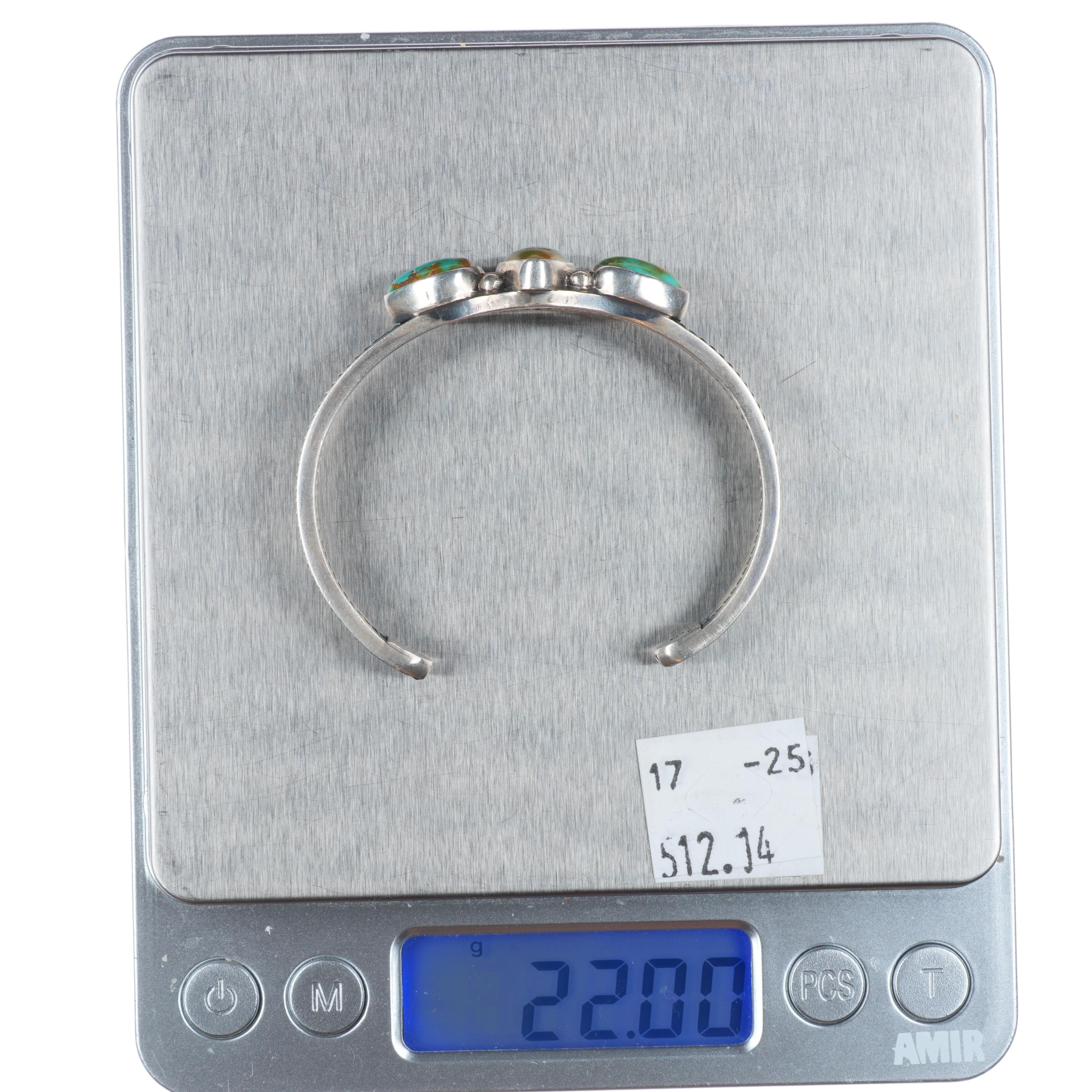 5.75" Vintage B Navajo sterling silver Royston turquoise cuff bracelet 3 stone. Tested and guaranteed solid sterling silver with weight and measurements in pictures. Great condition with age appropriate wear, circa last quarter of the 20th century. Has a B hallmark, unknown to me artist.