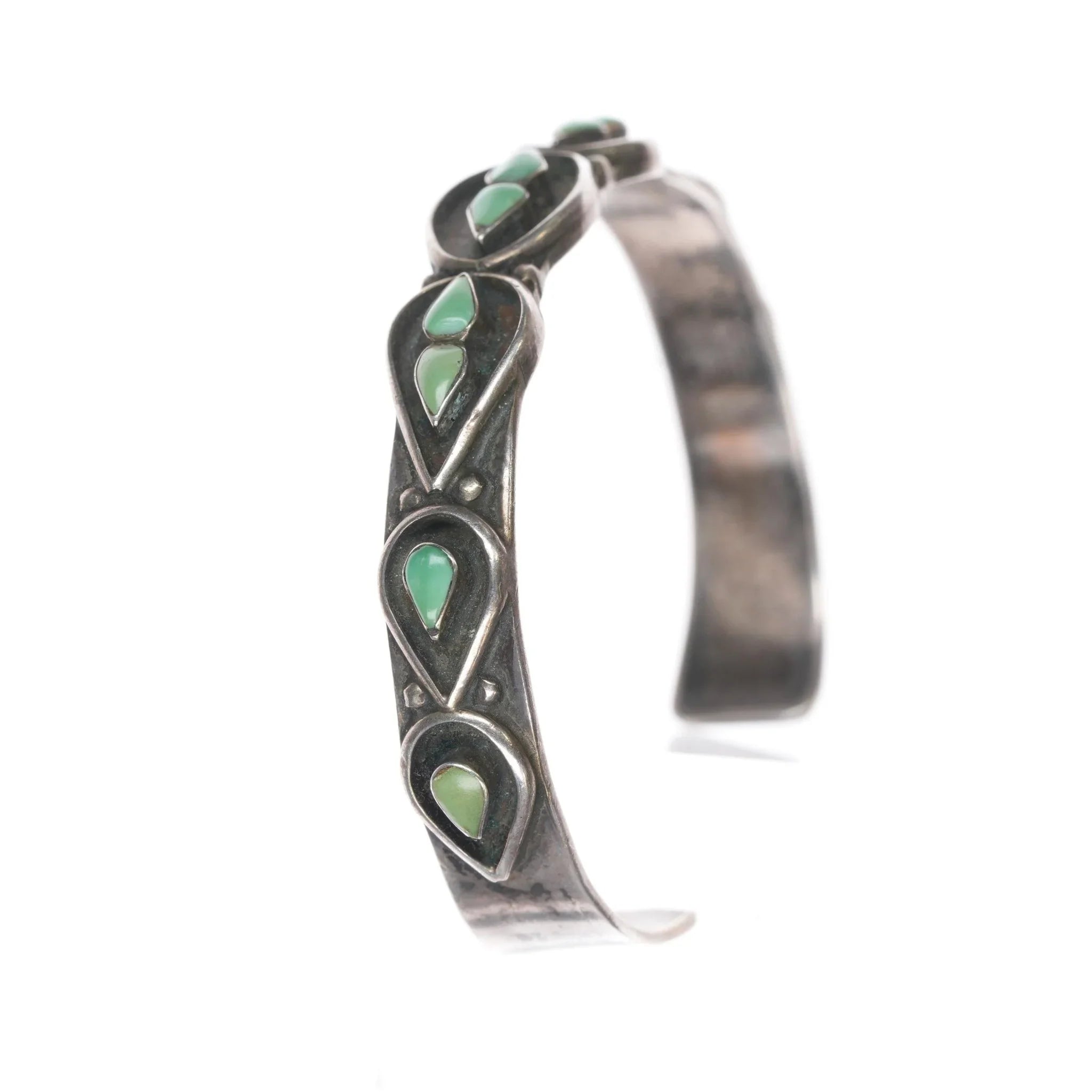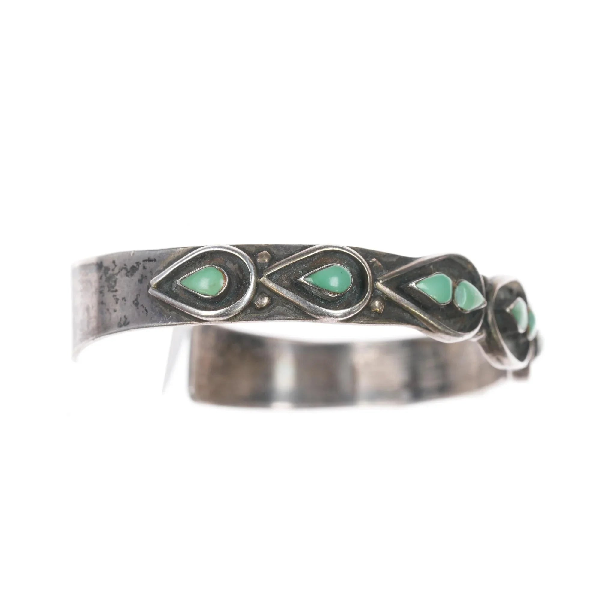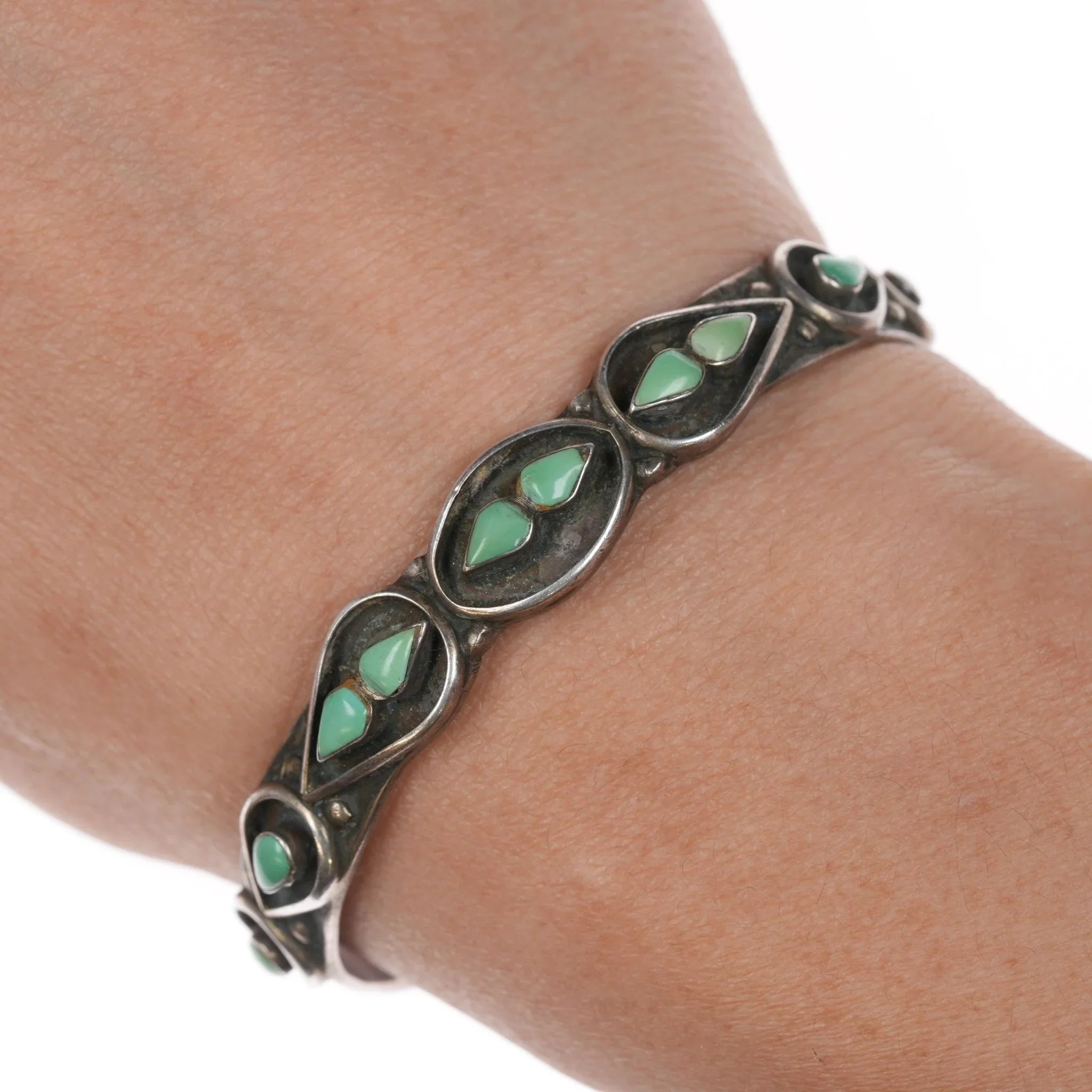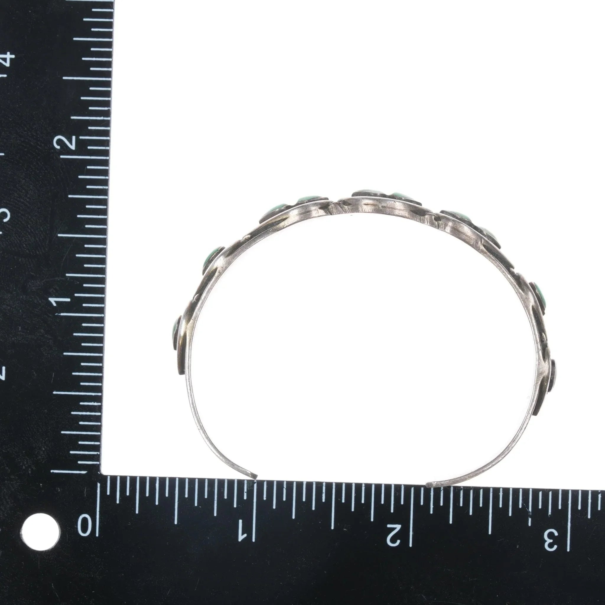 6 1/8" 50‘s-60‘s Zuni silver row cuff bracelet with turquoise. 6 1/8" including the gap. Apparently unmarked with no issues, solid sterling, weight and measurements in pics.
