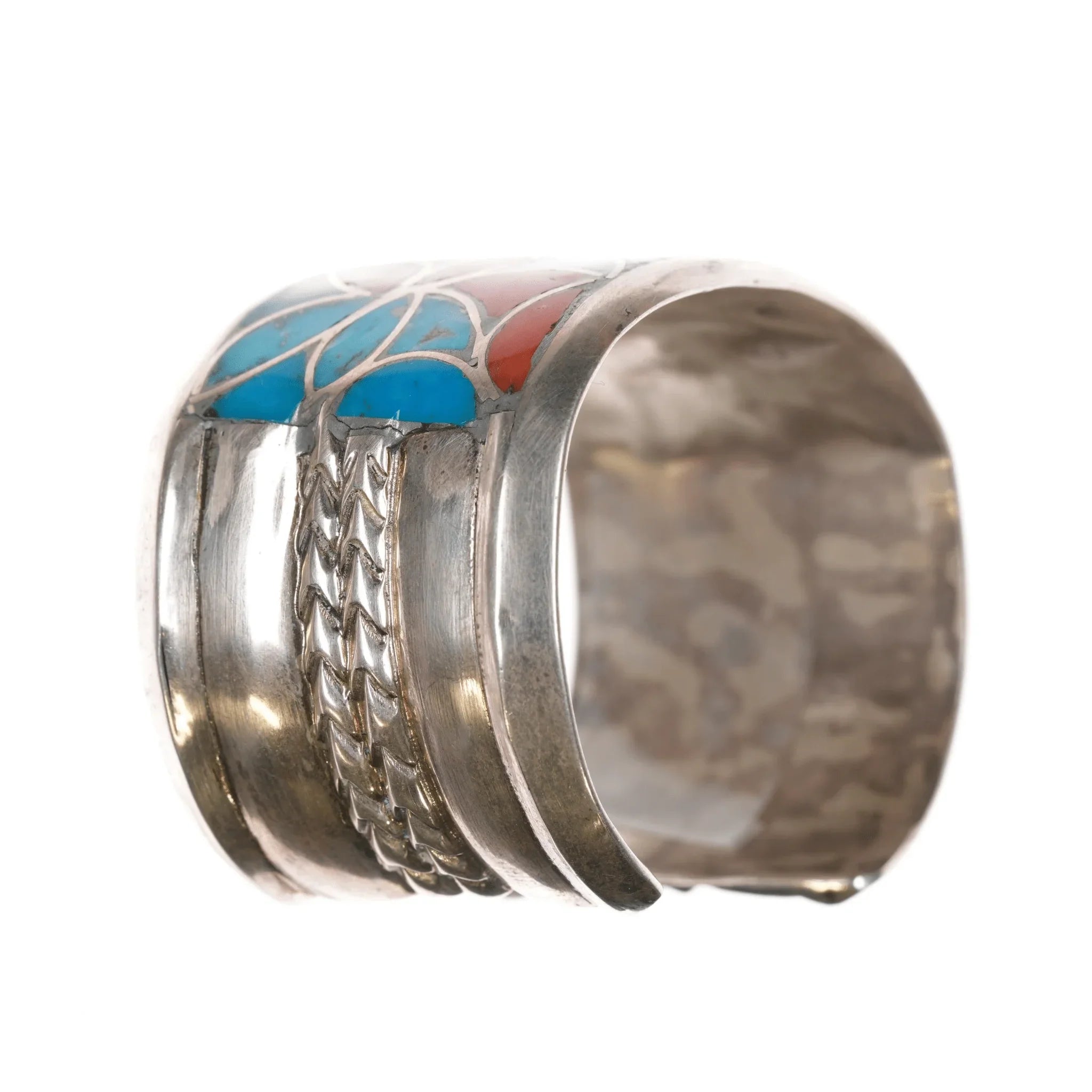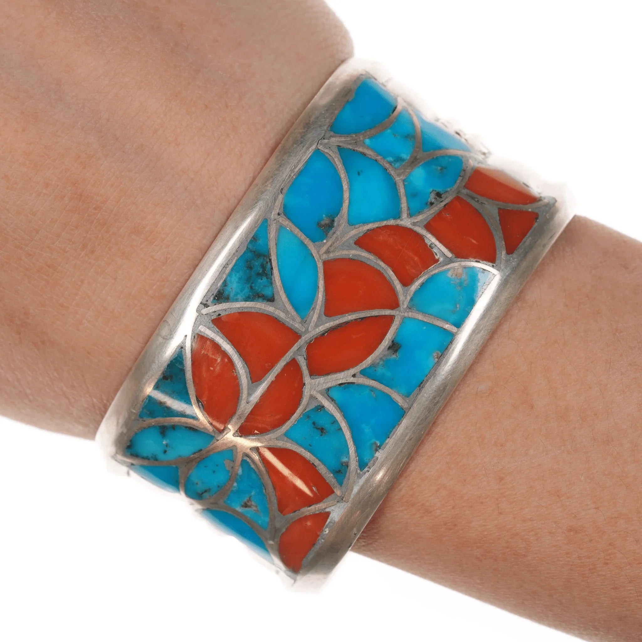 6 1/8" Alice Leekya Homer Zuni silver, turquoise and coral fishscale inlay cuff bracelet. J-404 "trader's code" scratched on the back twice.